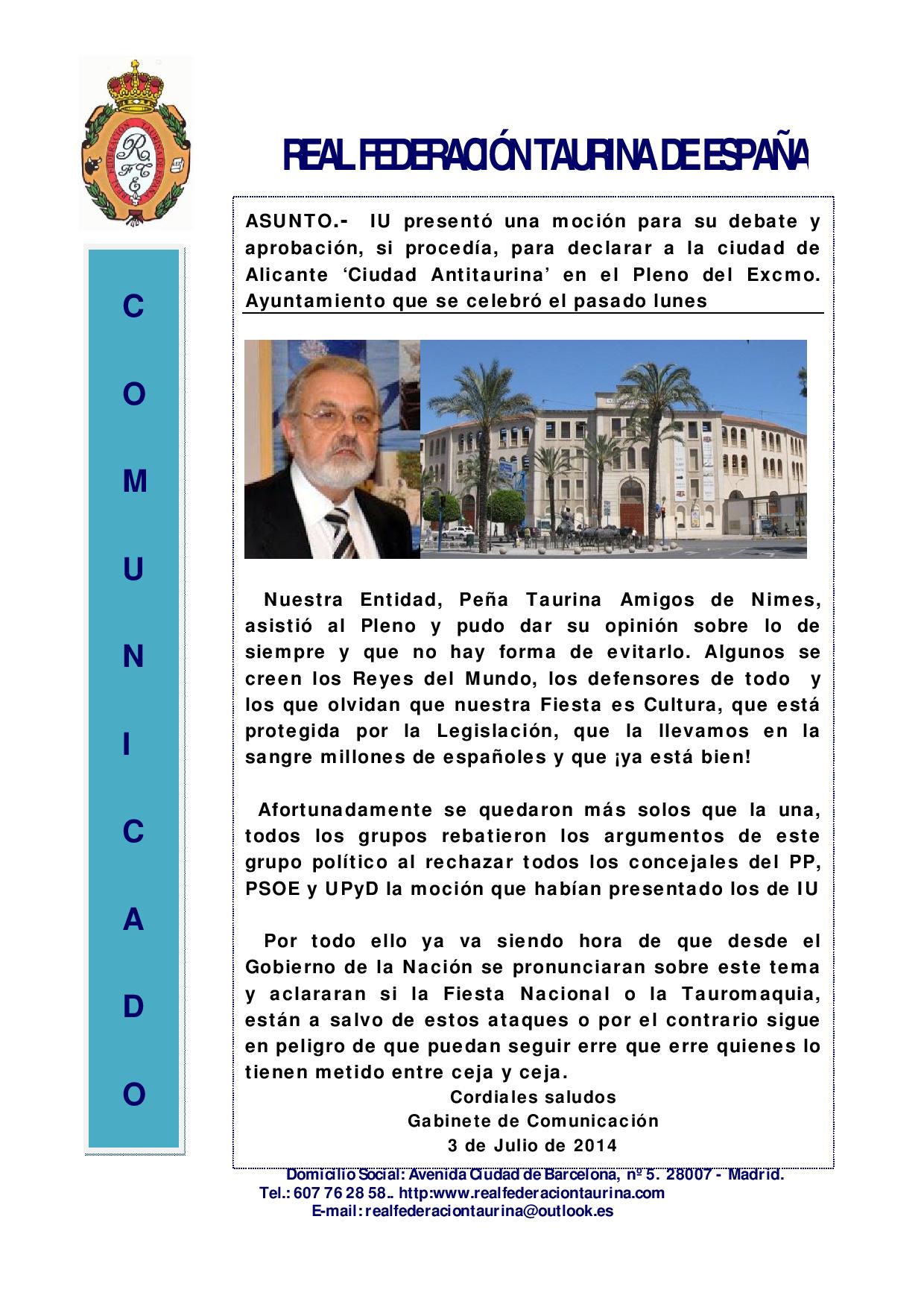 IU presentó moción para declarar a la ciudad de Alicante Ciudad Antitaurina en el Pleno del Excmo. Ayuntamiento