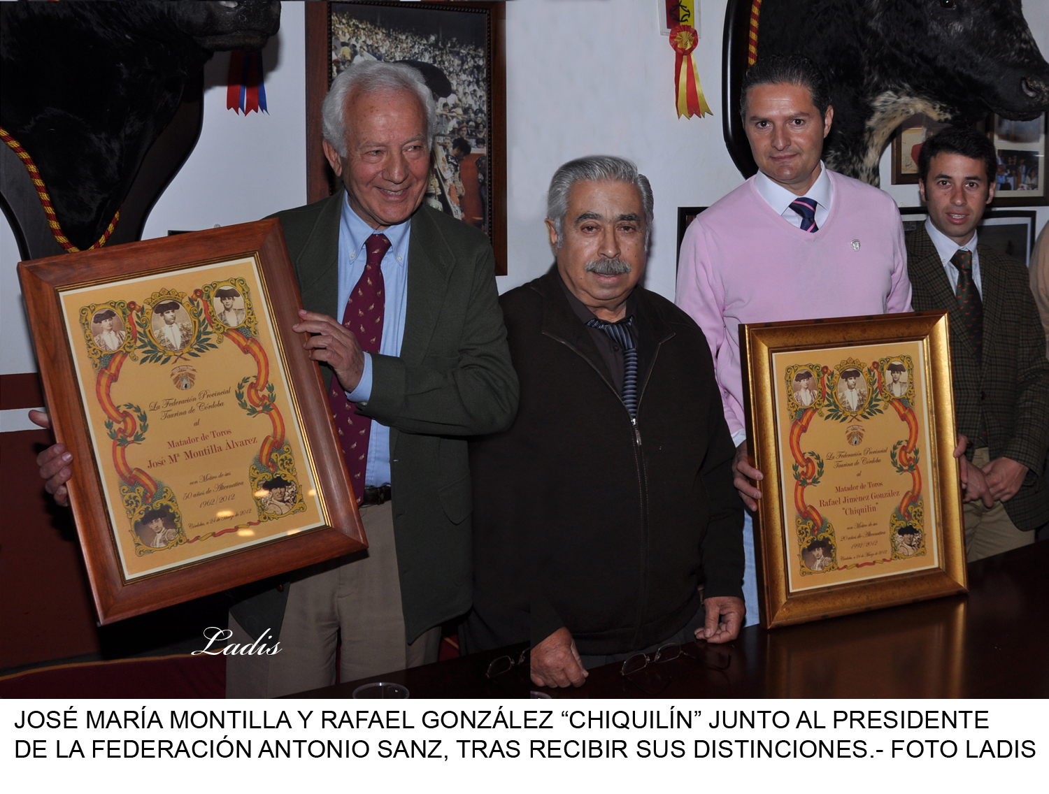Posteriormente, tras la proyectó un documental sobre José María Montilla (Escalera del Éxito 110), realizado por Aniceto Méndez catedrático responsable del Aula del Toro Bravo de la UCO, se procedió a homenajear a los matadores de toros José María Montilla al cumplir cincuenta años de alternativa y