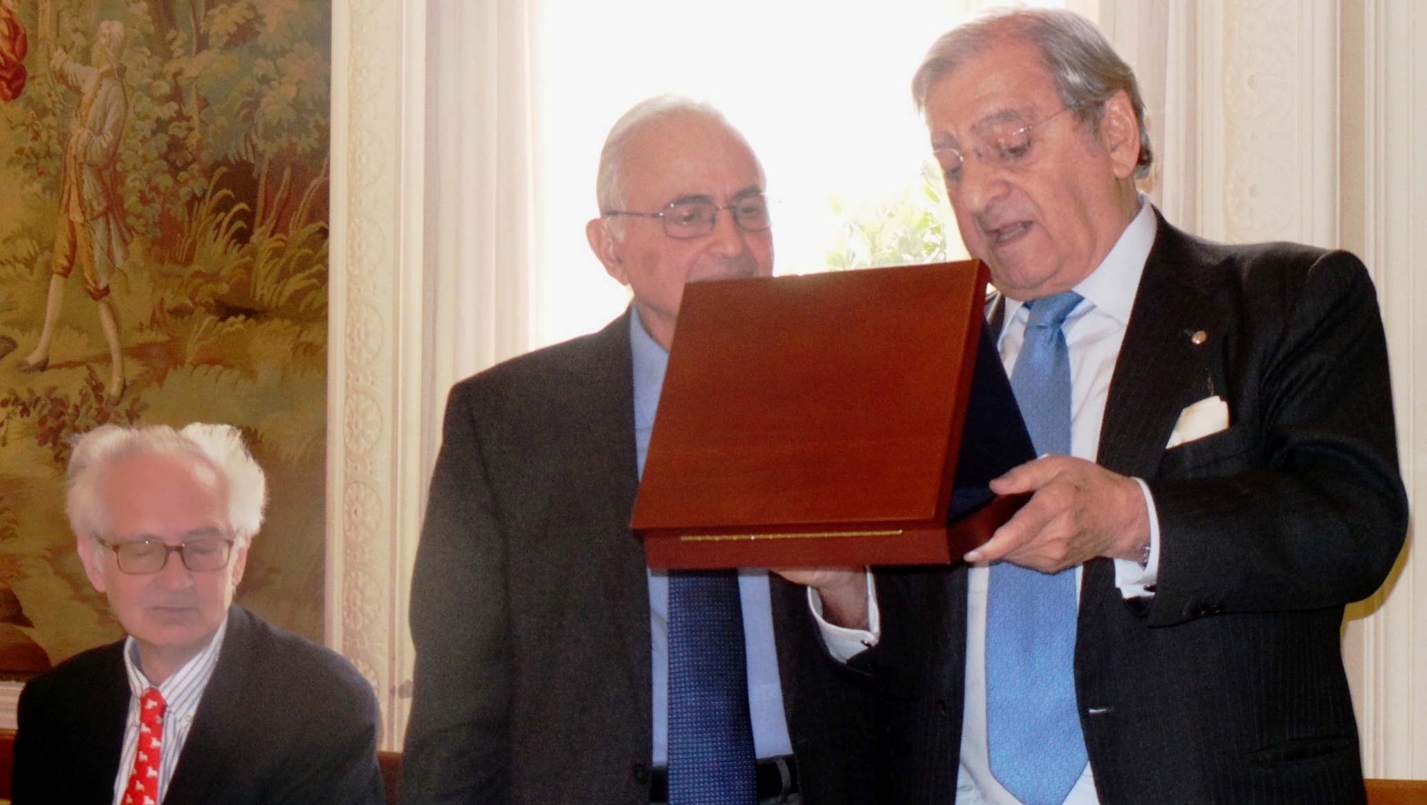 El presidente de FACULTA, D. Antonio Briones, entrega al premiado, D. David Shohet, una placa conmemorativa