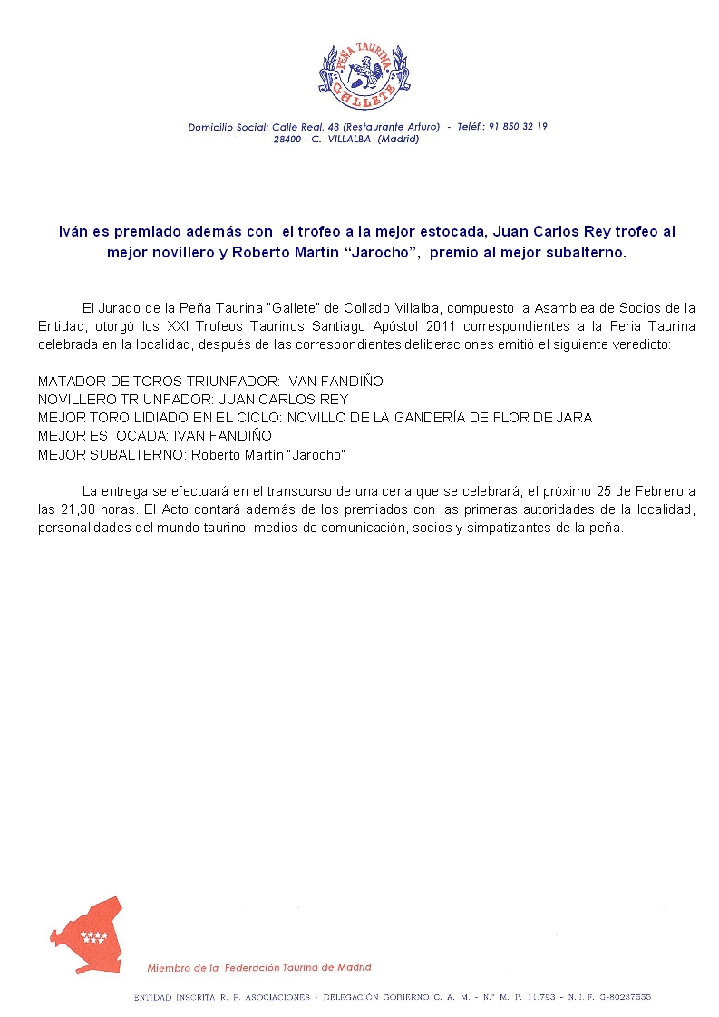 Iván Fandiño y la Ganadería de Flor de Jara, triunfadores de la Feria Taurina Santiago Apóstol 2011 de Collado Villalba