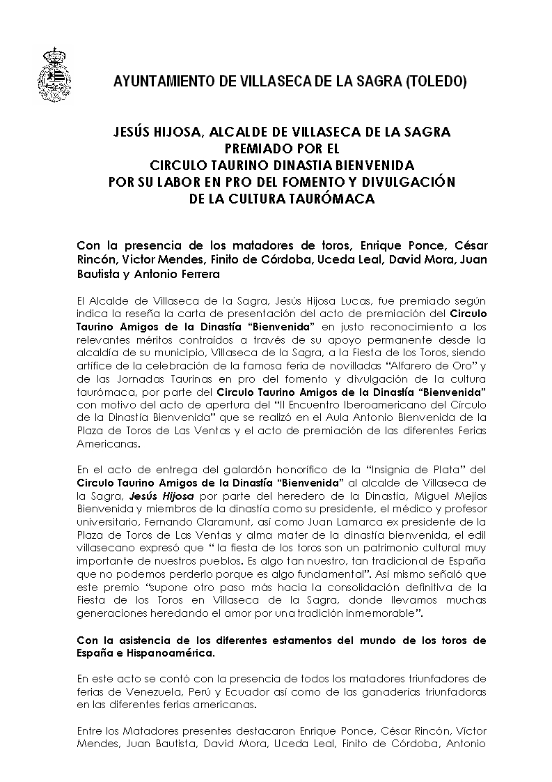 Jesús Hijosa, Alcalde de Villaseca de la Sagra premiado por la Dinastia Bienvenida