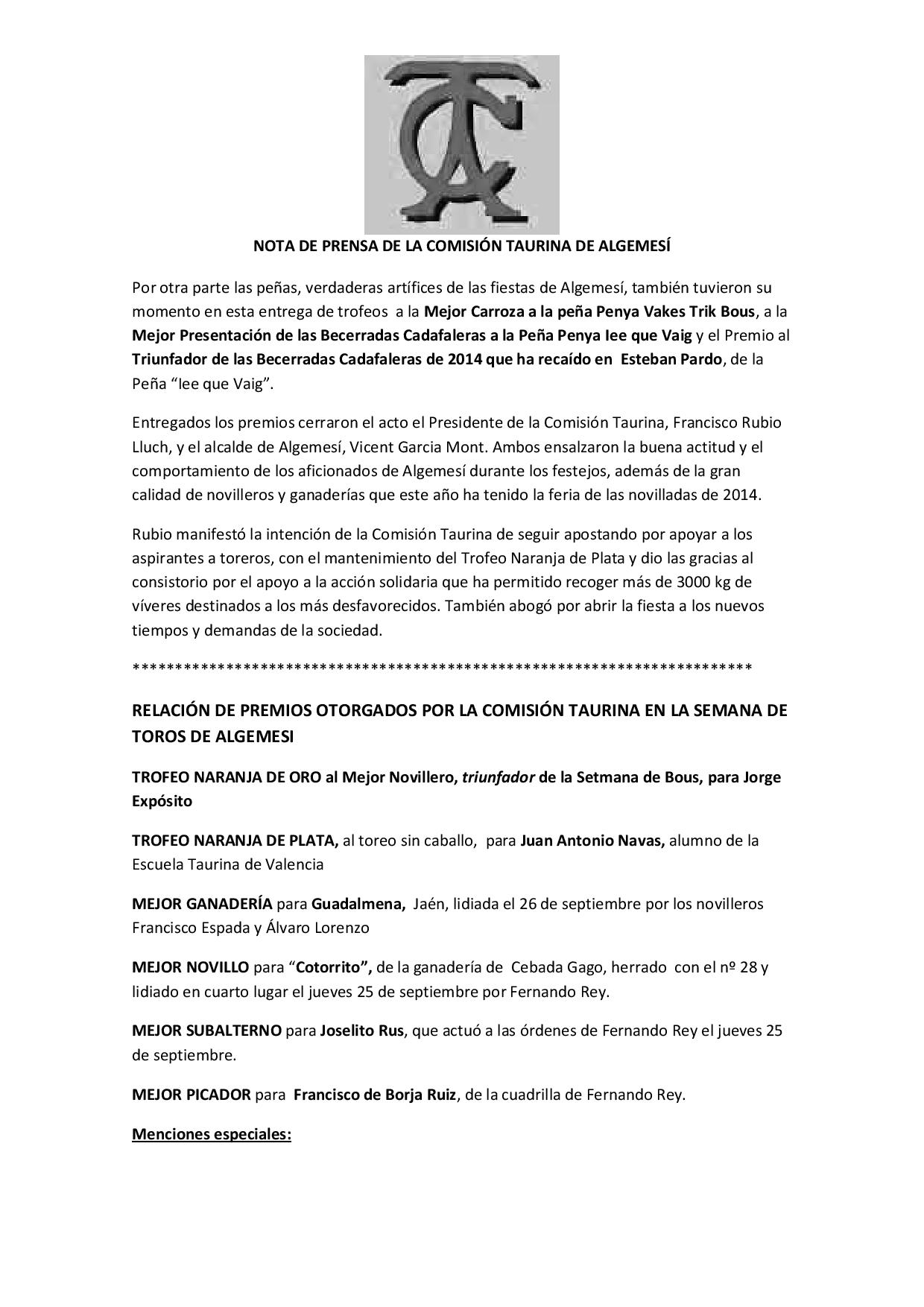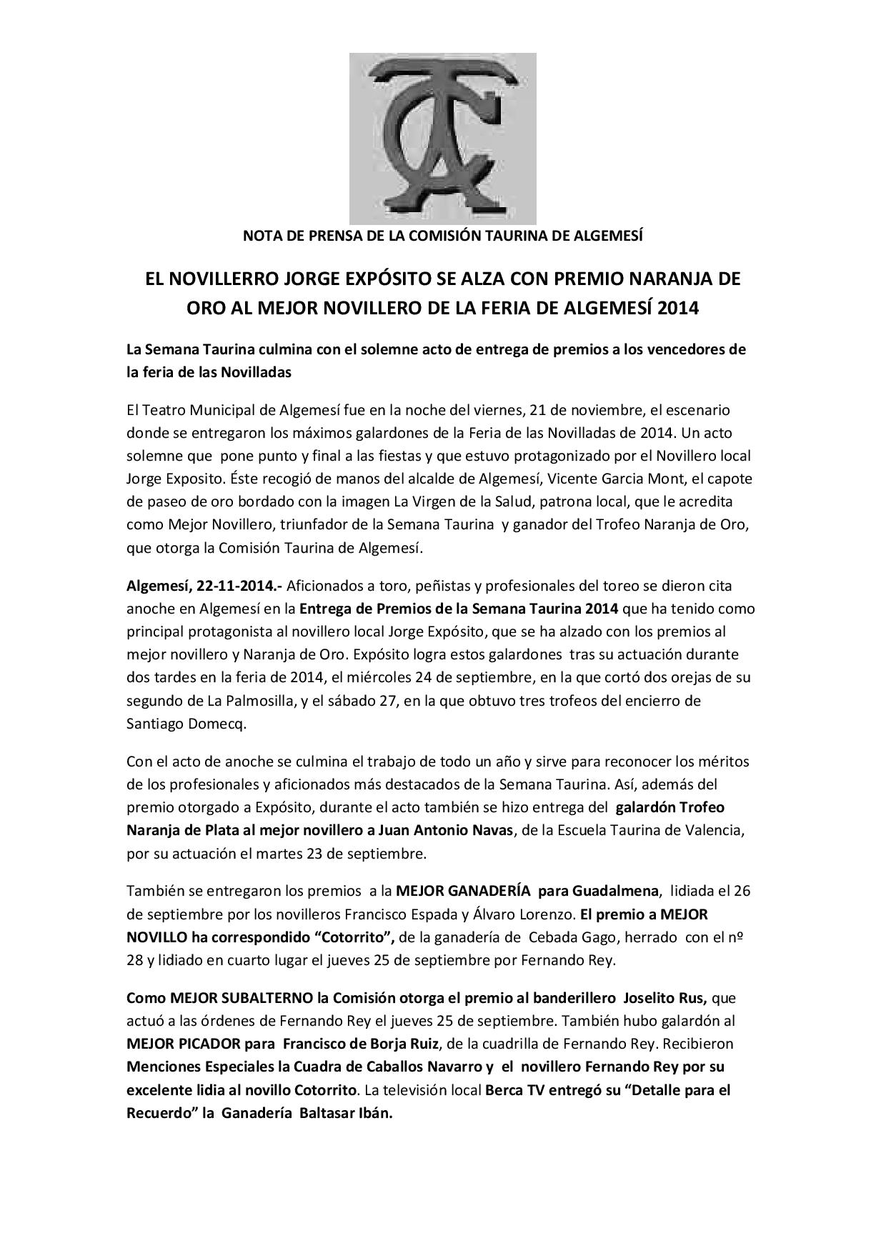 Jorge Expósito se alza con Premio Naranja de Oro al Mejor Novillero de la Feria de Algemesí 2014
