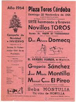 “El Cordobés”, Gabriel de la Haba “Zurito” y José María Montilla, fueron los toreros encargados de inaugurar el nuevo coso de “Los Califas” de Córdoba. Dicho evento acaeció el 9 de Mayo de 1965, lidiándose ganado de Carlos Núñez. José María, de blanco y plata, fue el primer diestro que pisó el albero de la nueva plaza como matador de toros. Toreó y estoqueó a “Cartujano”, marcado con el número 40, negro zaino. Le cortó una oreja y dio la vuelta al ruedo en su segundo. “El Cordobés” y “ Zurito”, cortaron a los ejemplares que les cupo en suerte, la oreja y las dos orejas y rabo, ambos con idénticos trofeos.