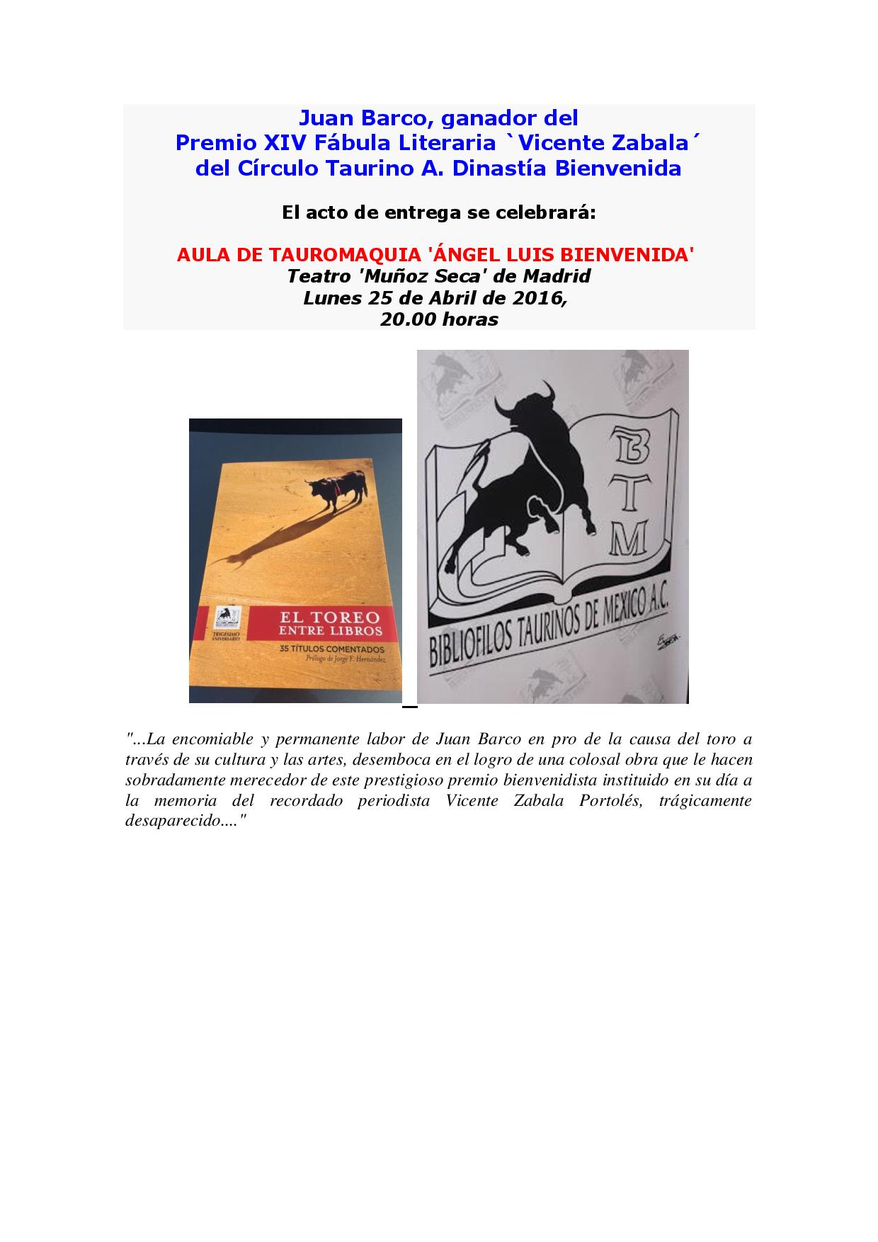 Juan Barco, ganador del Premio XIV Fábula Literaria `Vicente Zabala´ del Círculo Taurino A. Dinastía Bienvenida