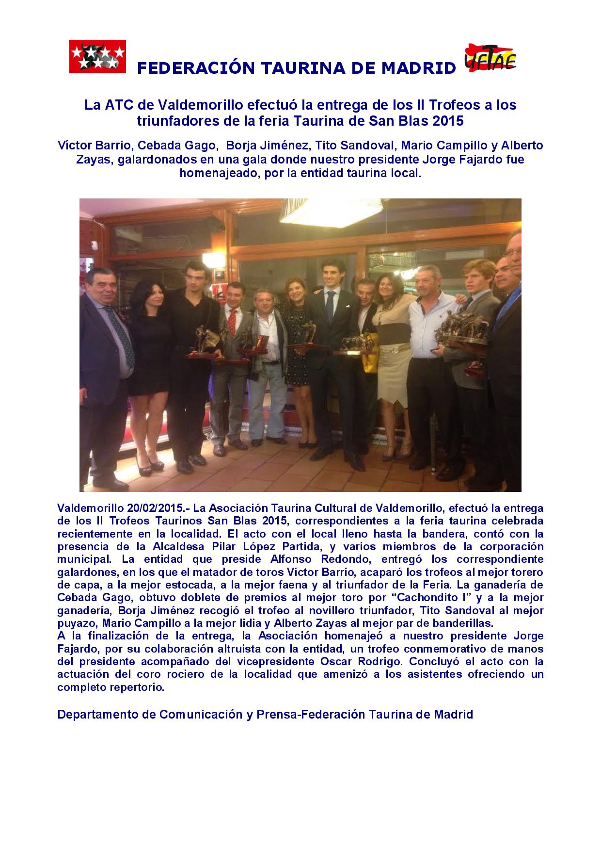 La ATC de Valdemorillo efectuó la entrega de los II Trofeos a los triunfadores de la feria Taurina de San Blas 2015