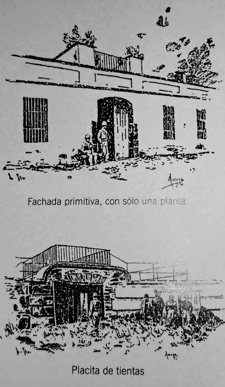 Dibujo de la fachada primitiva con una planta y la placita de tientas.