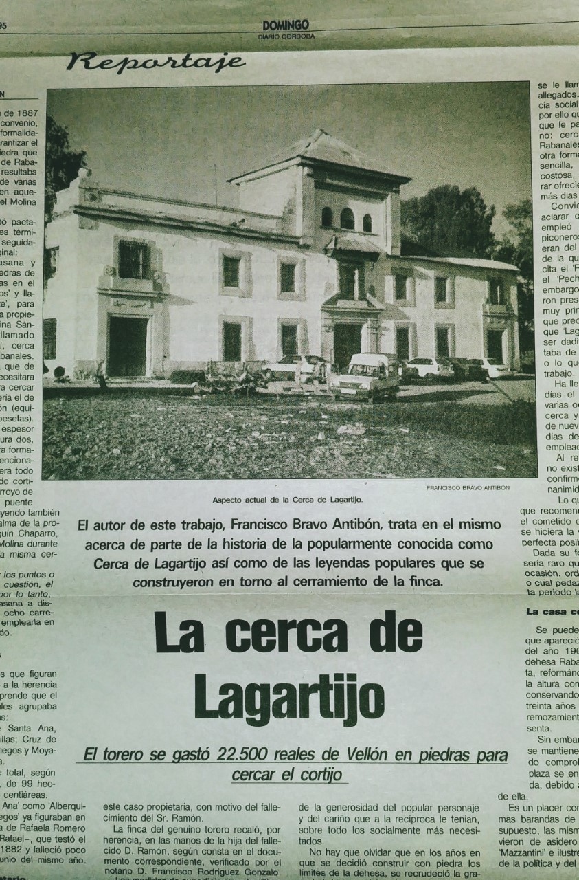 situadas en el pago de Mirabuenos y llamado del Brillante, para cercar el cortijo propiedad de Rafael Molina Sánchez “Lagartijo”, llamado Campiñuela Nueva, cerca del arroyo de Rabanales. Precio de la piedra, que de ambas canteras, necesitará el Rafael Molina para cercar el referido cortijo, sería el de 22.500 reales vellón. La cerca tendrá espesor de medio metro, de altura dos, y una tercia de piedra formará el cimiento. La mencionada cerca, comprenderá todo el terreno del referido cortijo, exceptuando el Arroyo de Rabanales hasta el puente del ferrocarril, excluyendo también una haza de tierra calma, propiedad de don Joaquín Chaparro, si no la adquiere el Molina, durante la construcción de la misma cerca”…