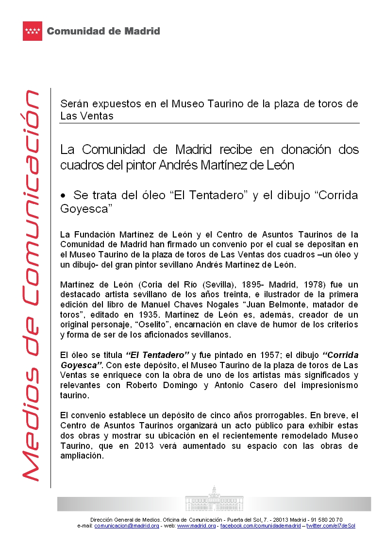 La Comunidad de Madrid recibe en donación dos cuadros del pintor Andrés Martínez de León