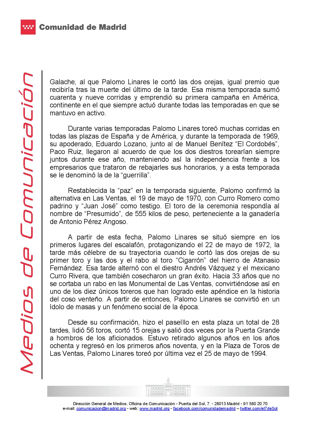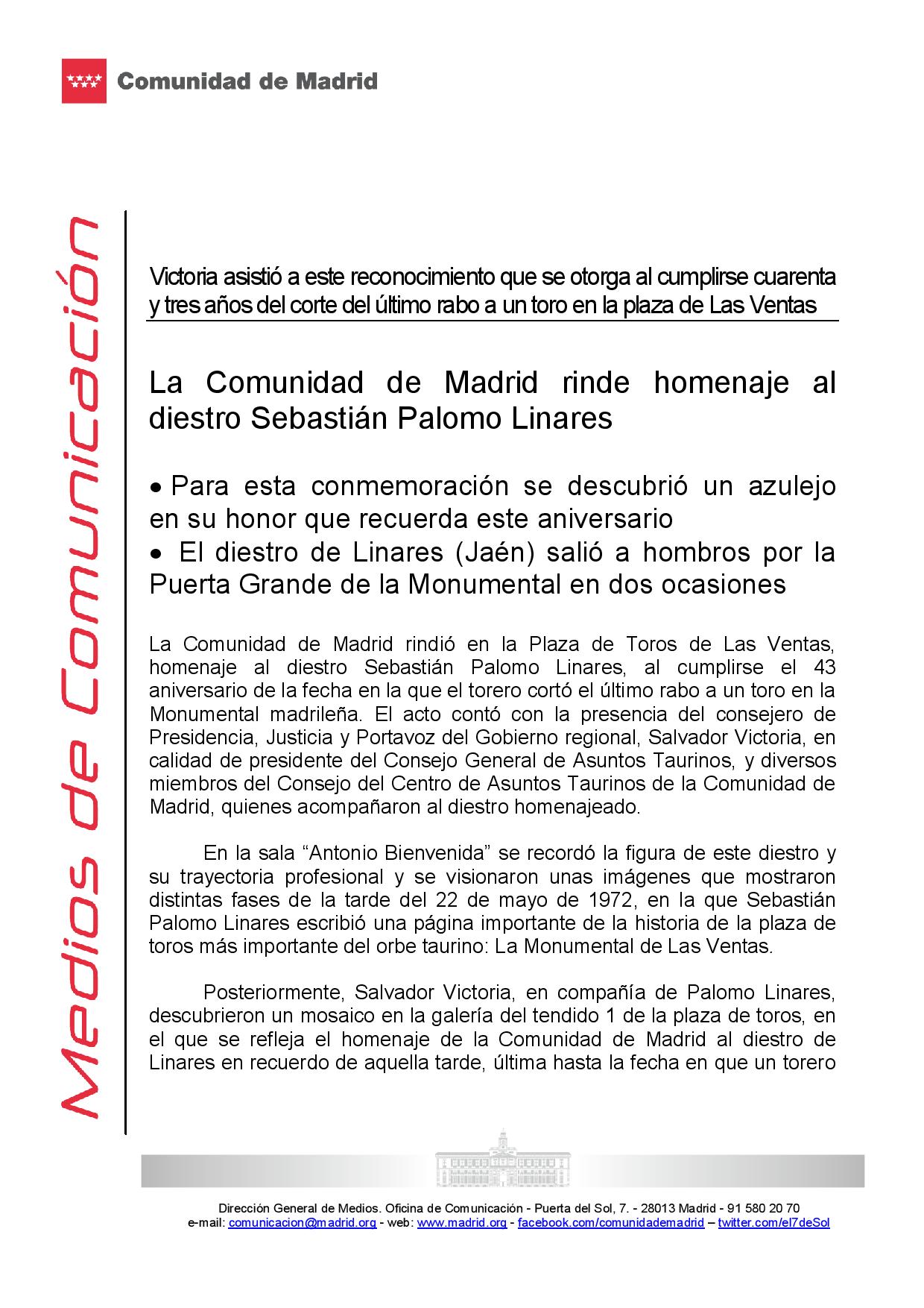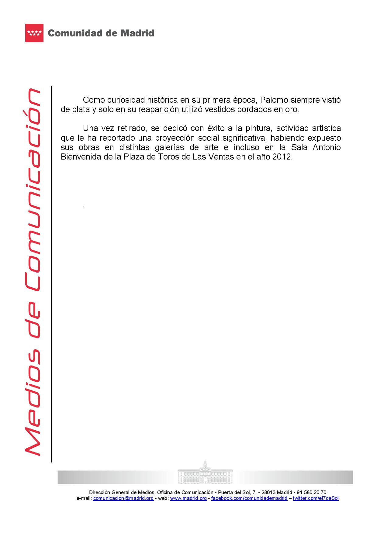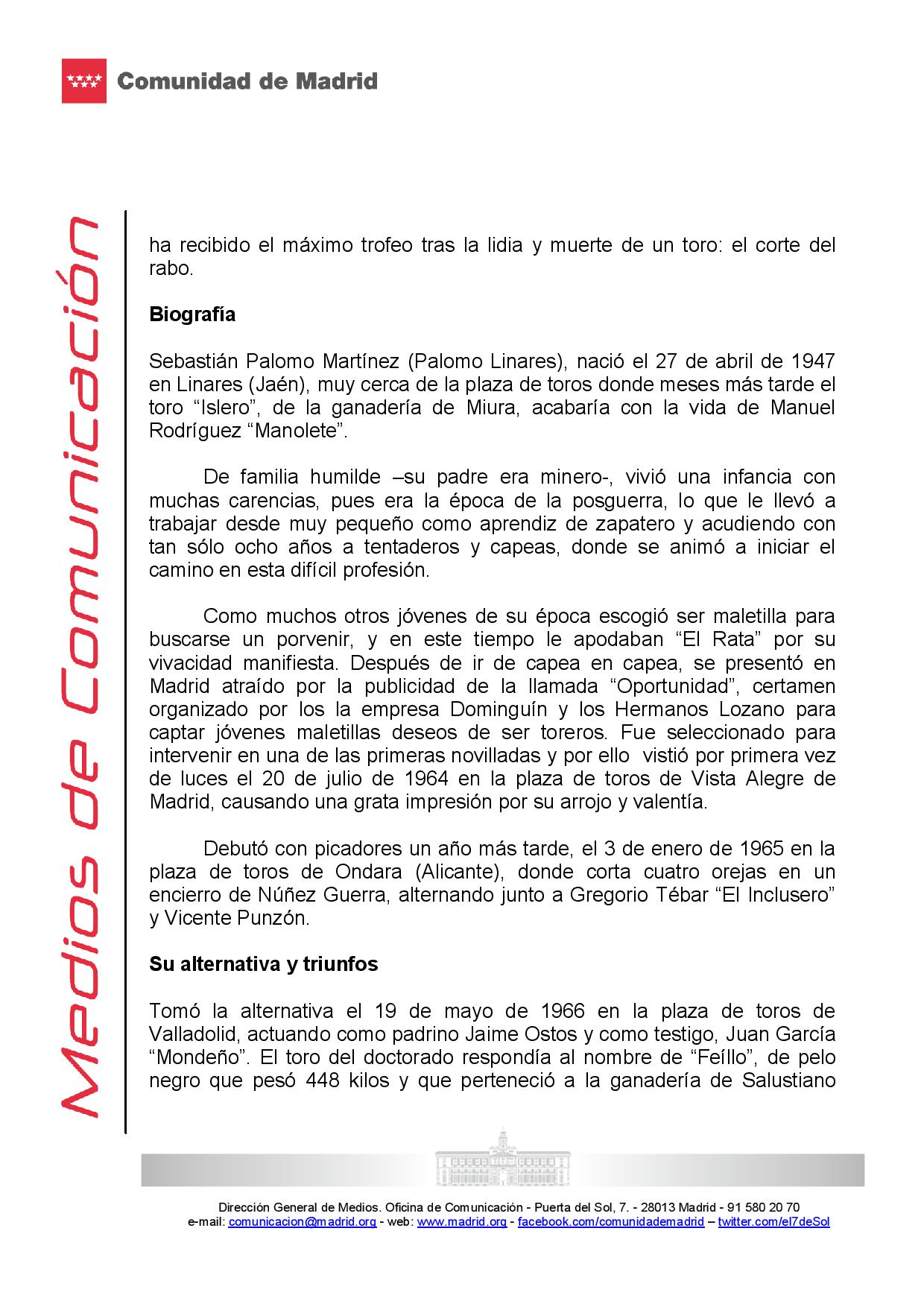 La Comunidad de Madrid rinde homenaje al diestro Sebastián Palomo Linares (Escalera del Éxito nº 28)