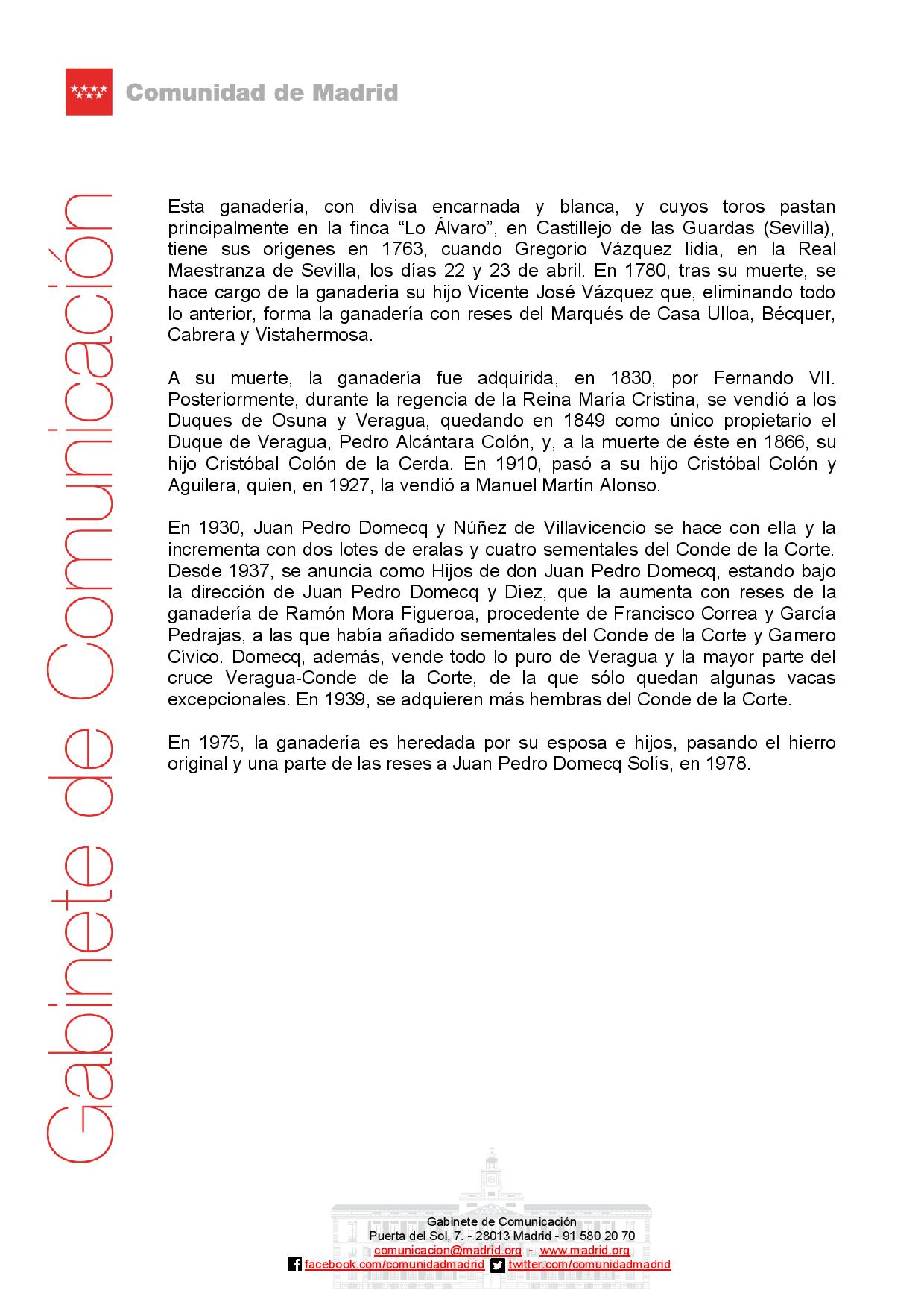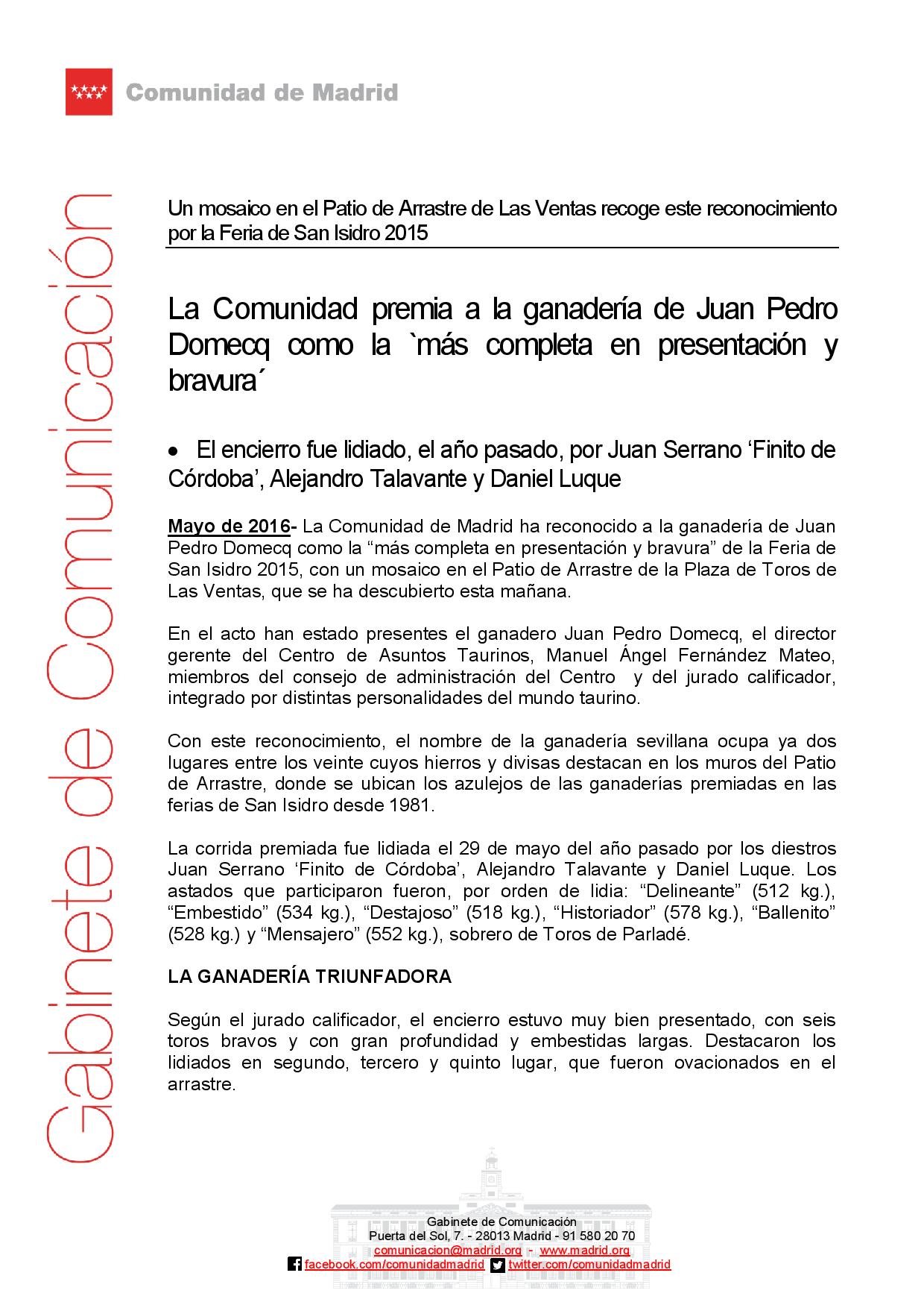 La Comunidad premia a la ganadería de Juan Pedro Domecq como la `más completa en presentación y bravura´