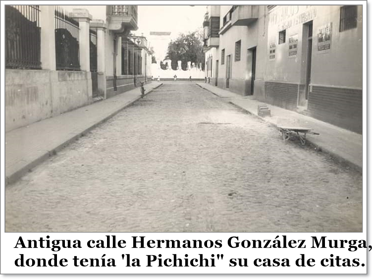 “La decencia” es una norma moral que en aquellos años no solían cumplir aquellas jóvenes muchachas que se buscaba la vida entregando su cuerpo a un hombre a cambio de dinero. Una de estas señoritas era “La Pichichi”, sevillana de nacimiento, que tenía su negocio, el más caro y famoso de Córdoba, en la calle Hermanos González Murga, en un edificio ya desaparecido. Se dice que no era guapa, aunque sí muy resultona, simpática y con trapío como decimos los taurinos. “La Casa de la Pichichi» era una institución. De su dueña se cuenta una anécdota que demuestra su popularidad y los conocimientos que llegó a tener entre la clase pudiente. Cierto día se personó en una entidad bancaria a realizar una operación y como pensara que no había sido bien tratada, se dirigió con paso firme y decidido al despacho del director de dicha entidad para exponer sus quejas. Sin permiso de nadie, ni solicitar autorización con una familiaridad del que hace una cosa rutinaria, abrió la pesada puerta y se introdujo con toda normalidad y confianza en aquel lujoso despacho mientras repetía en tono elevado el nombre del director: “!Oye Leopoldo! ¡Leopoldo!…El director que, en esos momentos, celebraba una reunión con conocidos propietarios y labradores no pudo sino balbucir cortadamente: “!Señora, por favor! ¿Quién es usted?… “La Pichichi» que esperaba encontrarlo solo empezó a dudar. La situación se hizo tensa, lo componentes de aquella reunión se miraban unos a otros, temiendo alguno de ellos que le saludase con la misma familiaridad, porque casi todos tenían motivos para ello, hasta que uno de los presentes, célebre matador de toros ya retirado, viejo y con fama de no tener pelos en la lengua, rompió la tirante situación diciendo con toda normalidad: “¿Qué te pasa Concha? ¿Qué quieres? ¡Y usted don Leopoldo no sea más hipócrita y no pregunte quién es, porque a Concha la conoce to’a Córdoba”.