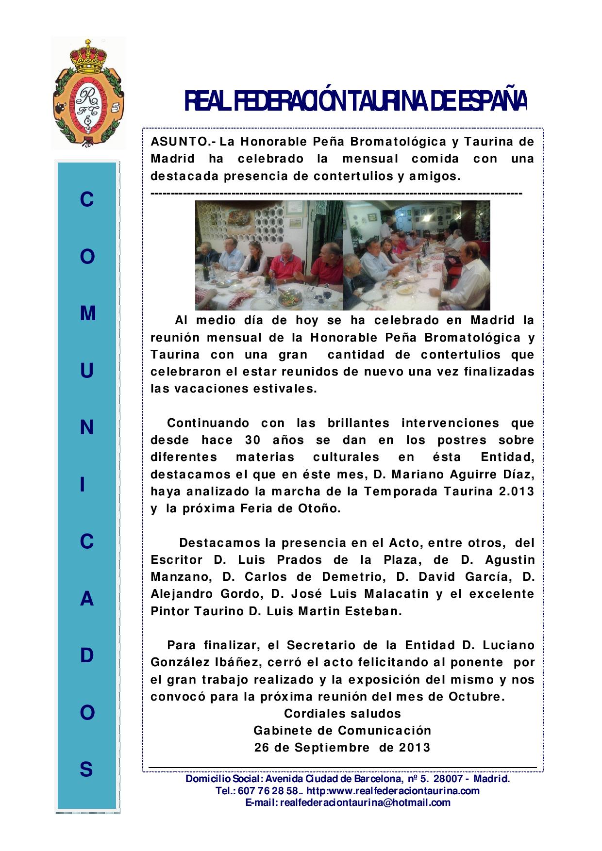 La Honorable Peña Bromatológica y Taurina de Madrid celebra su comida mensual