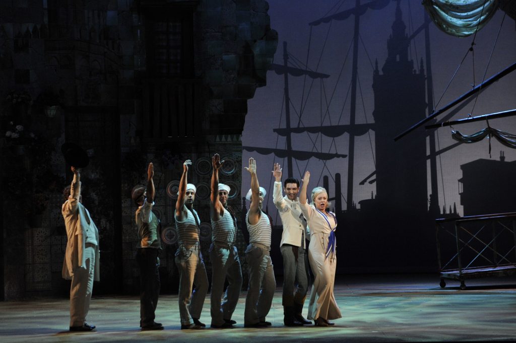 La lista de protagonistas es grande, empezando por la dirección musical de Guillermo García Calvo –director musical del coliseo– al frente de la Orquesta de la Comunidad de Madrid, Titular del Teatro y del Coro Titular del Teatro de la Zarzuela, la dirección de escena de Curro Carreres, en el amplio reparte están Ángel Ódena, Javier Franco, Carmen Solís, Berna Perles, Andeka Gorrotxategi, Alejandro del Cerro, Ángel Ruiz, Anna Gomà, Jesús Méndez, Gurutze Beitia, José Luis Martínez, Manuel de Andrés, Antonio MM, Rocío Galán, David Sigüenza, Lara Chaves, Alberto Caballero o Resu Morales. La original y cambiante escenografía en la que cabe destacar la espectacular aparición del barco que llega a puerto, está firmada por Ricardo Sánchez Cuerda, el colorido vestuario por Jesús Ruiz, la cuidada iluminación es de Eduardo Bravo y la bella y estudiada coreografía es de Antonio Perea. Se ha tenido el acierto de mantener la ambientación original del año 1950, lo que resulta idóneo para la obra y su historia y destaca, más aún, su extraordinario valor por la época del estreno.