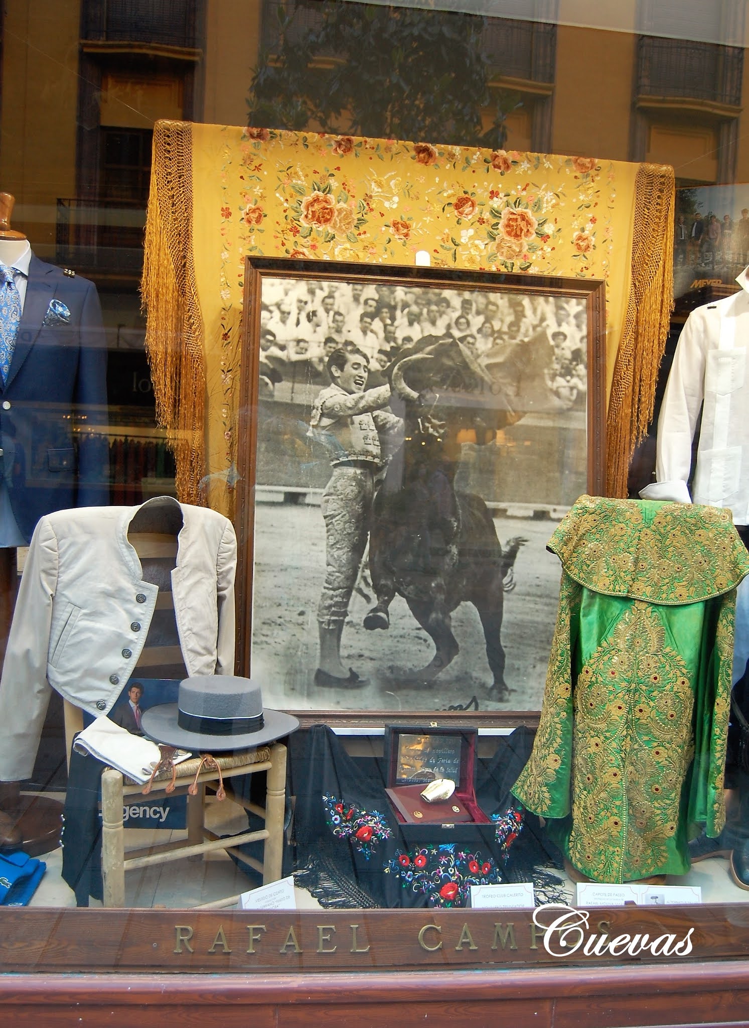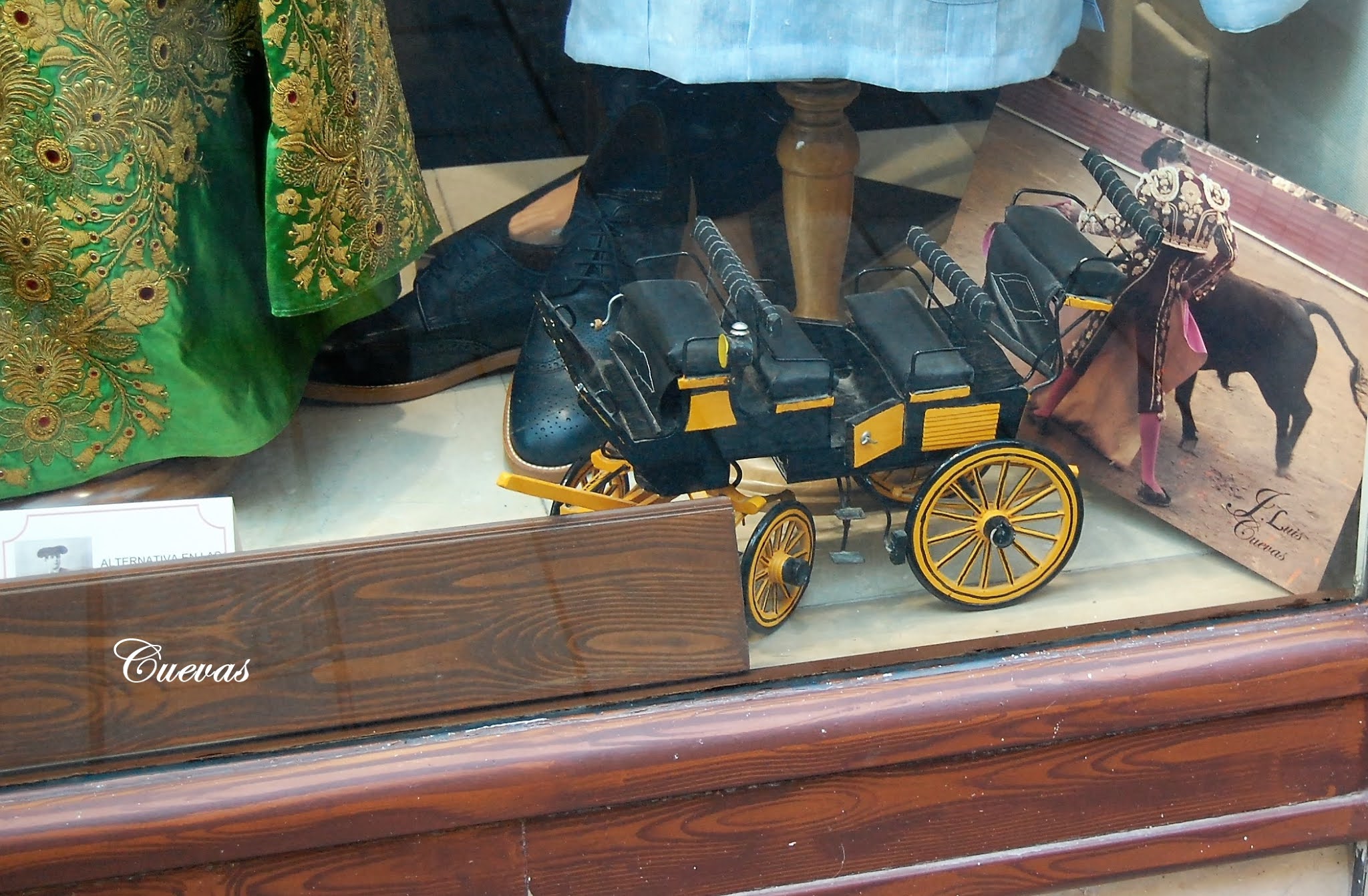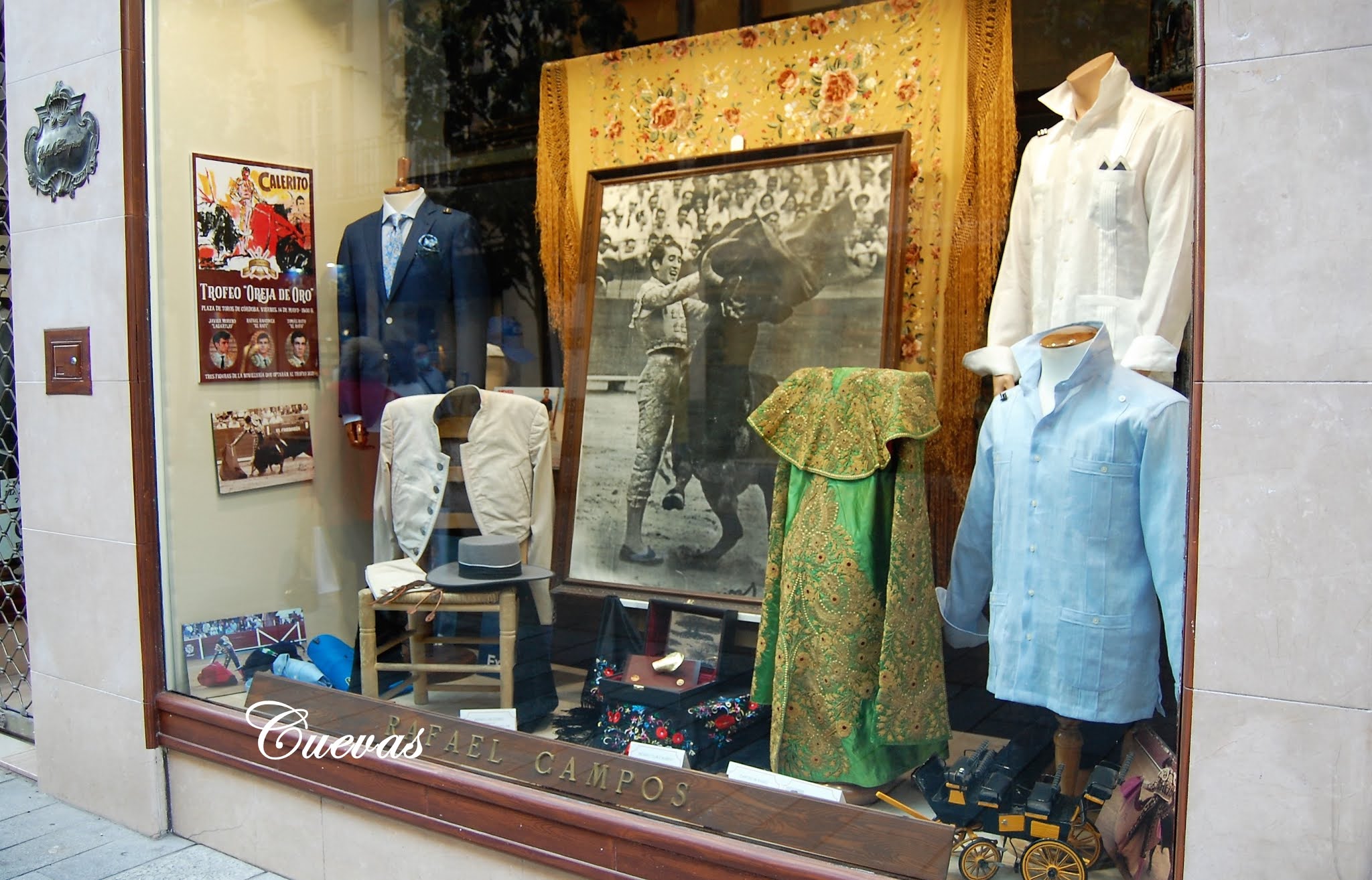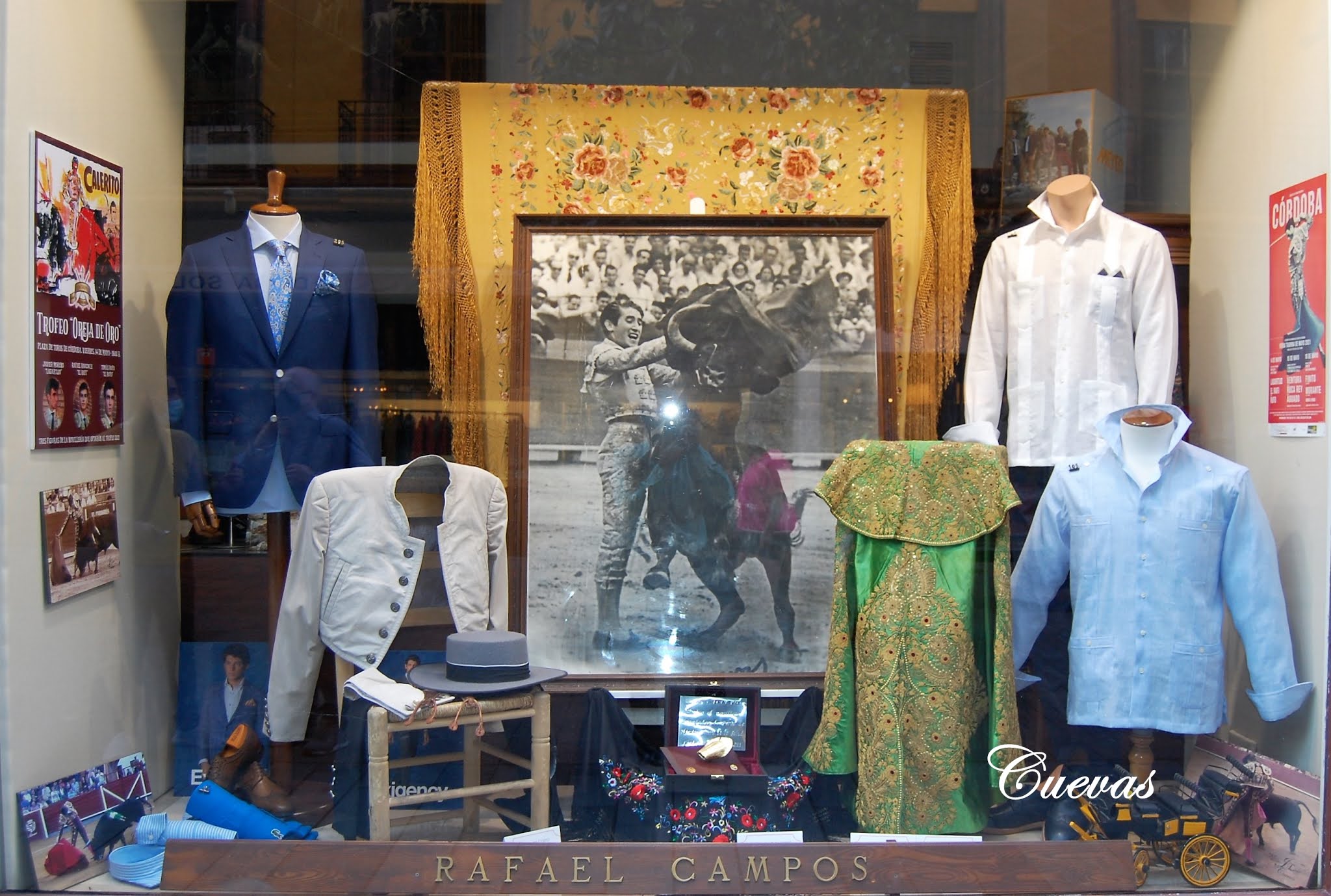 El escaparate Una fotografía de Manuel Calero “Calerito”, debajo de la cual se muestra la OREJA DE ORO, con un bellísimo mantón de manila, a su izquierda un capote de paseo de Rafael Molina «Lagartijo Chico» una silla decorada con un traje corto de «Finito de Córdoba», unas fotos de Finito cuyo autor es el fotógrafo José Luis Cuevas, varios carteles y unas obras de arte de Antonio de la Peña, y el coso de Los Tejares, cuya maqueta por sus dimensiones, se encuentra expuesta en el interior de la tienda.