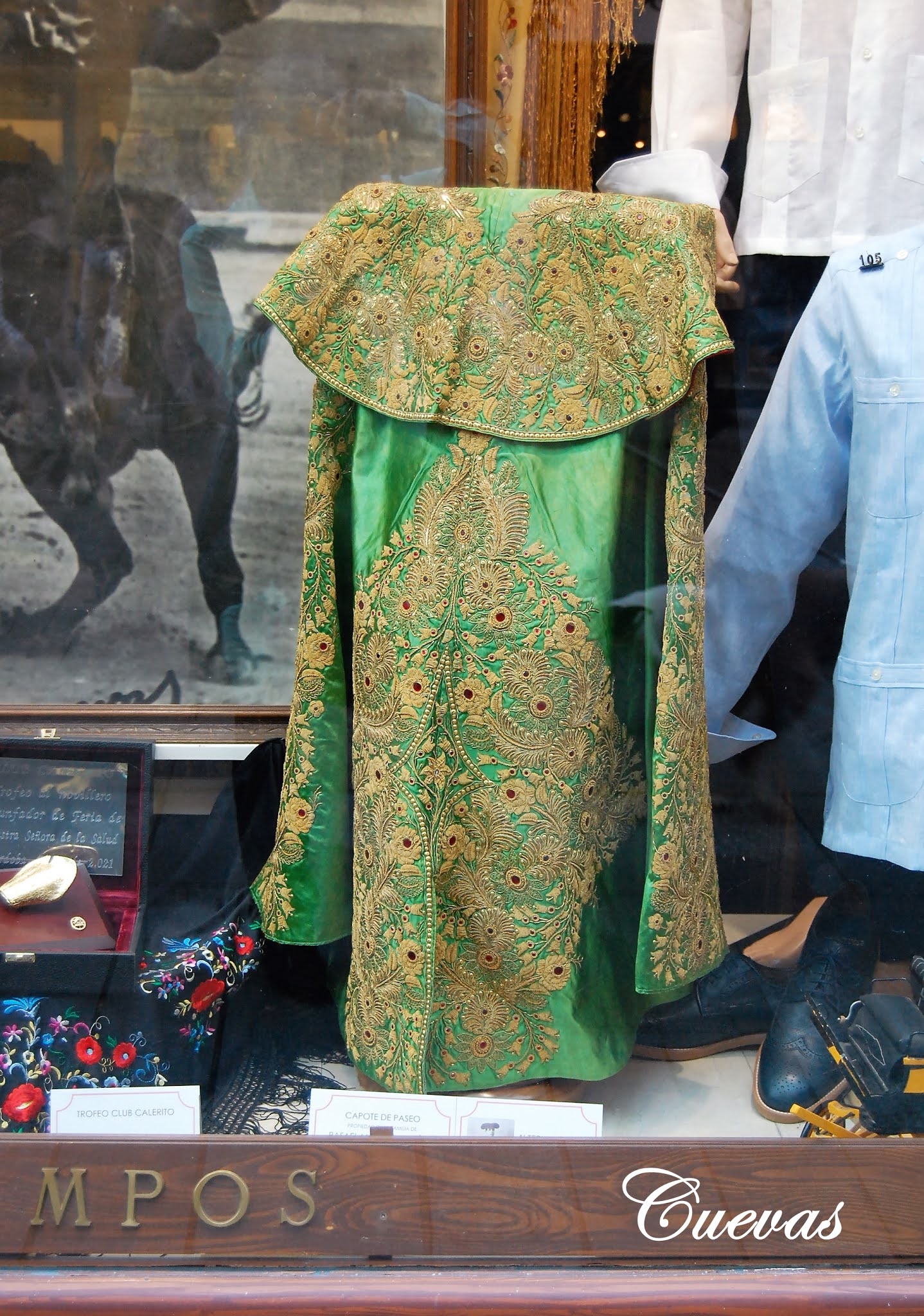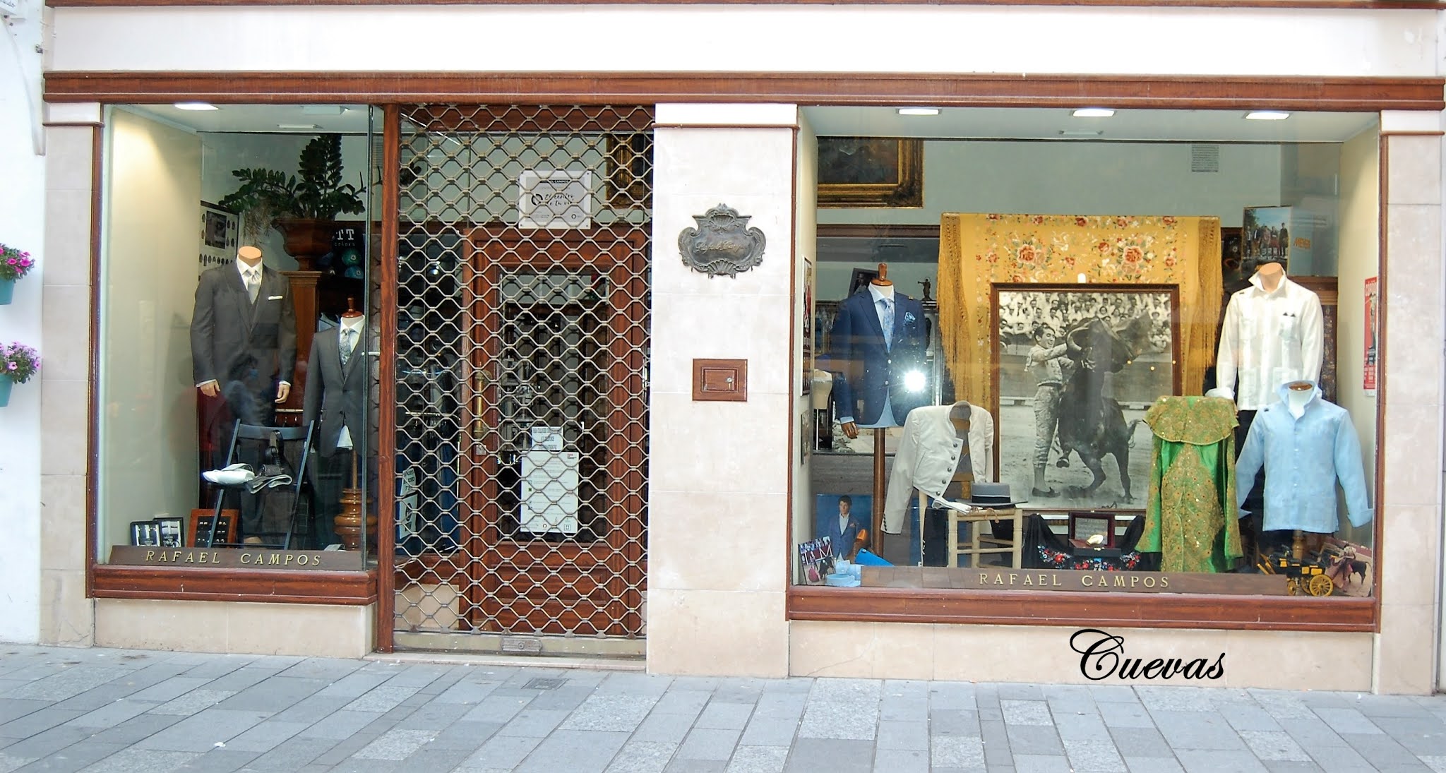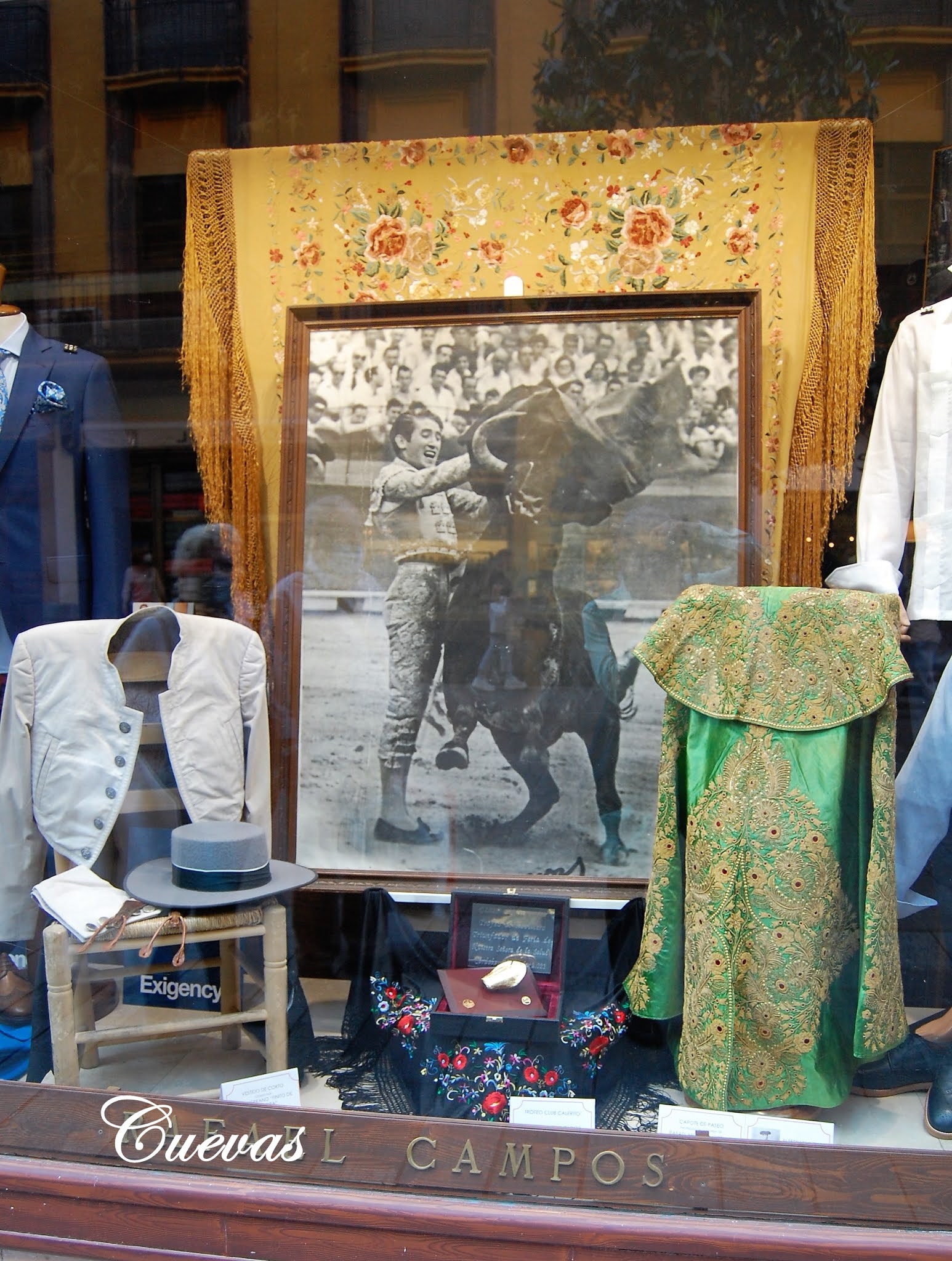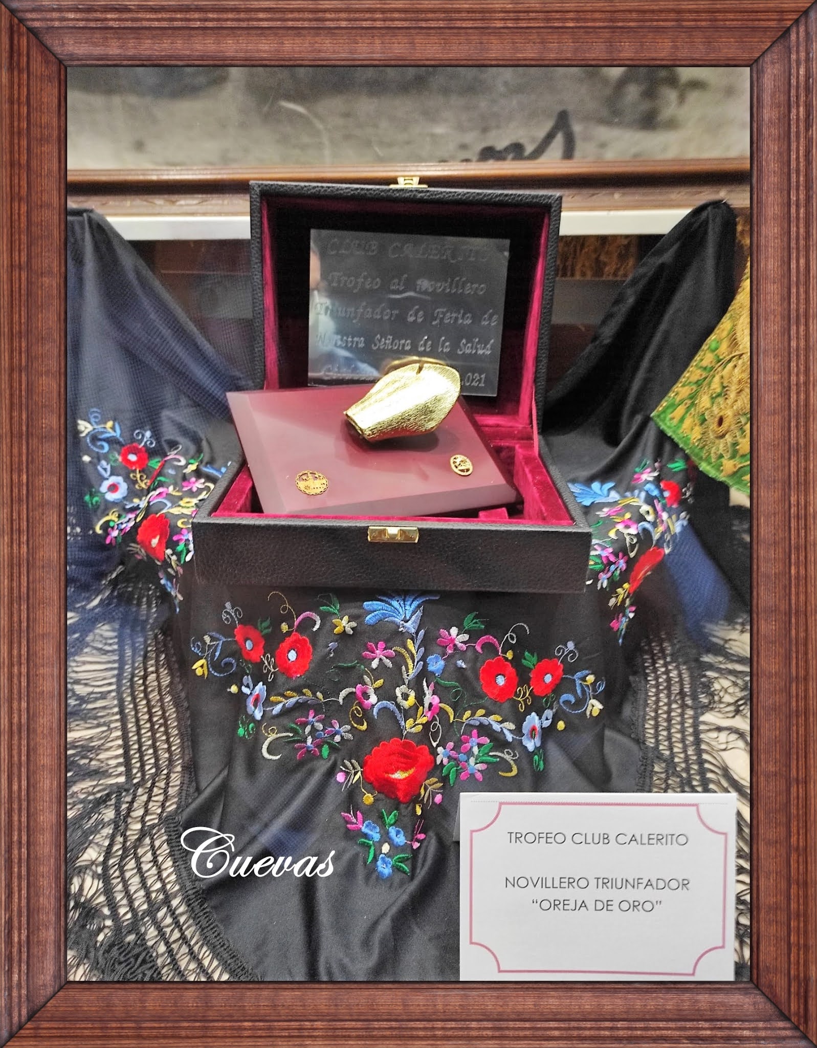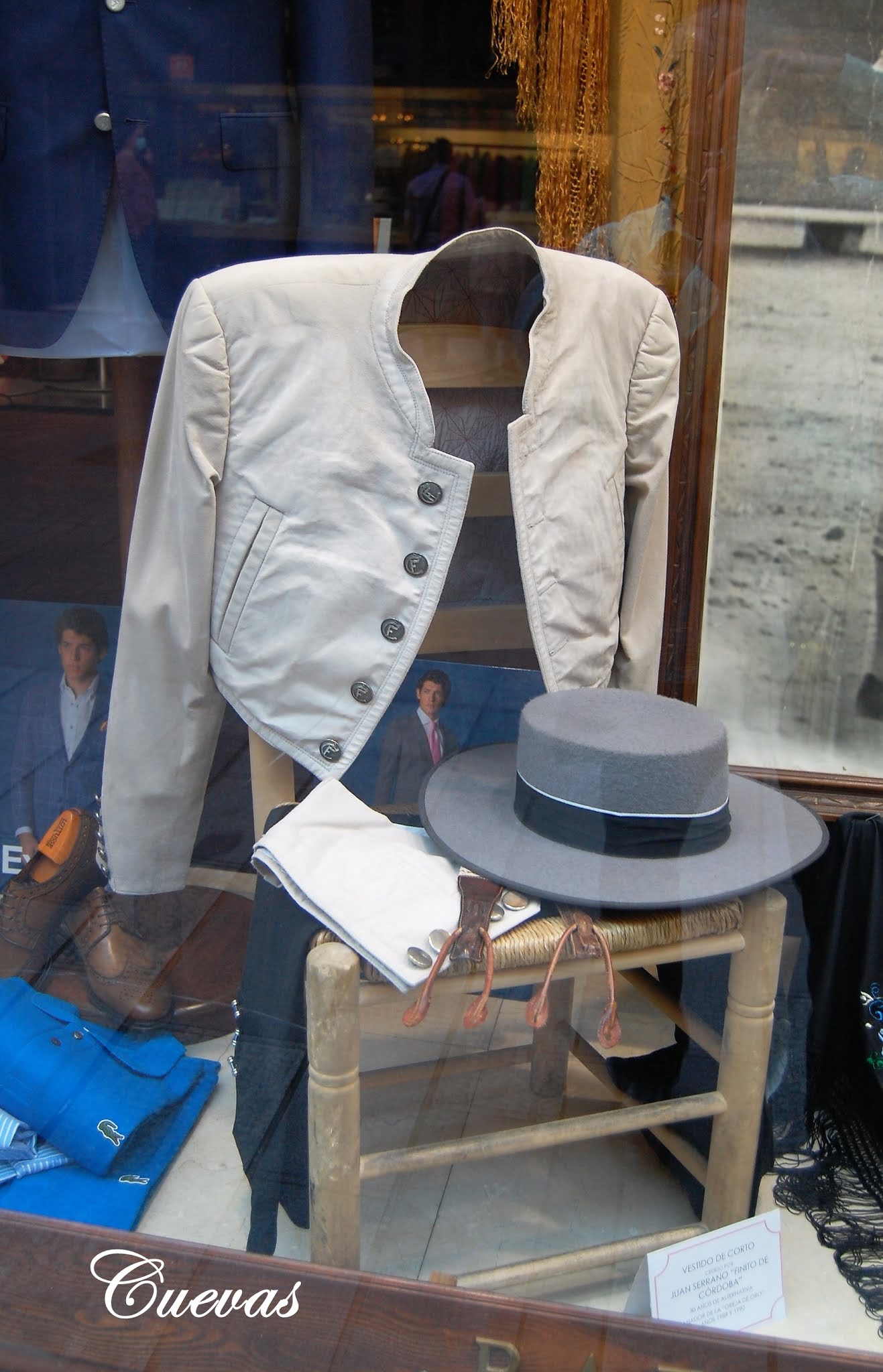 El escaparate Una fotografía de Manuel Calero “Calerito”, debajo de la cual se muestra la OREJA DE ORO, con un bellísimo mantón de manila, a su izquierda un capote de paseo de Rafael Molina «Lagartijo Chico» una silla decorada con un traje corto de «Finito de Córdoba», unas fotos de Finito cuyo autor es el fotógrafo José Luis Cuevas, varios carteles y unas obras de arte de Antonio de la Peña, y el coso de Los Tejares, cuya maqueta por sus dimensiones, se encuentra expuesta en el interior de la tienda.