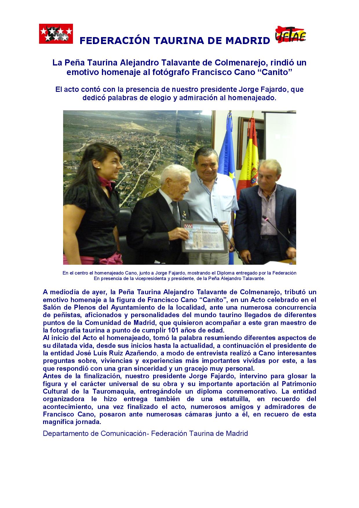La Peña Taurina Alejandro Talavante de Colmenarejo, rindió un emotivo homenaje al fotógrafo Francisco Cano Canito