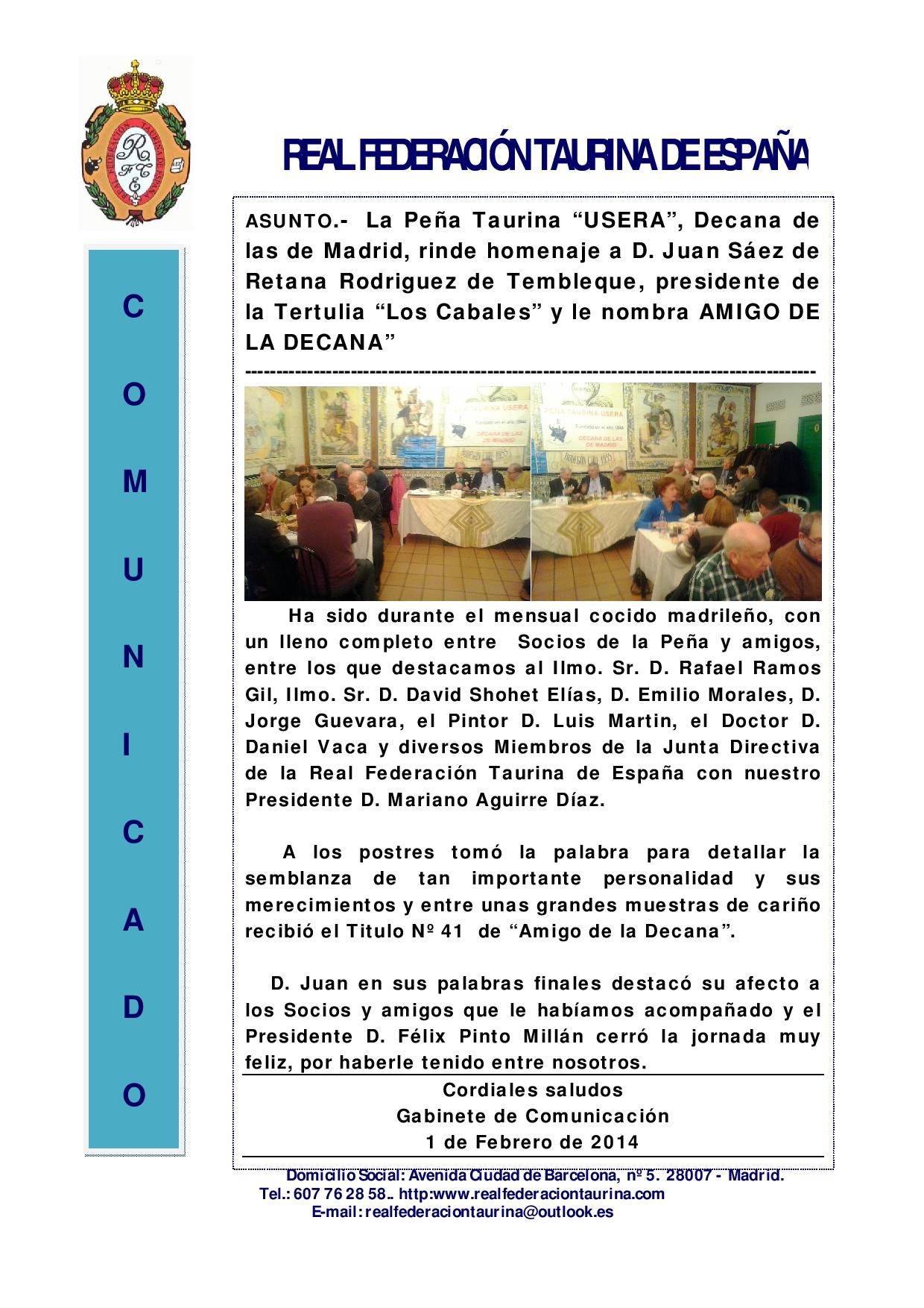 La Peña Taurina Usera, Decana de las de Madrid, rinde homenaje a D. Juan Sáez de Retana, presidente de la Tertulia Los Cabales