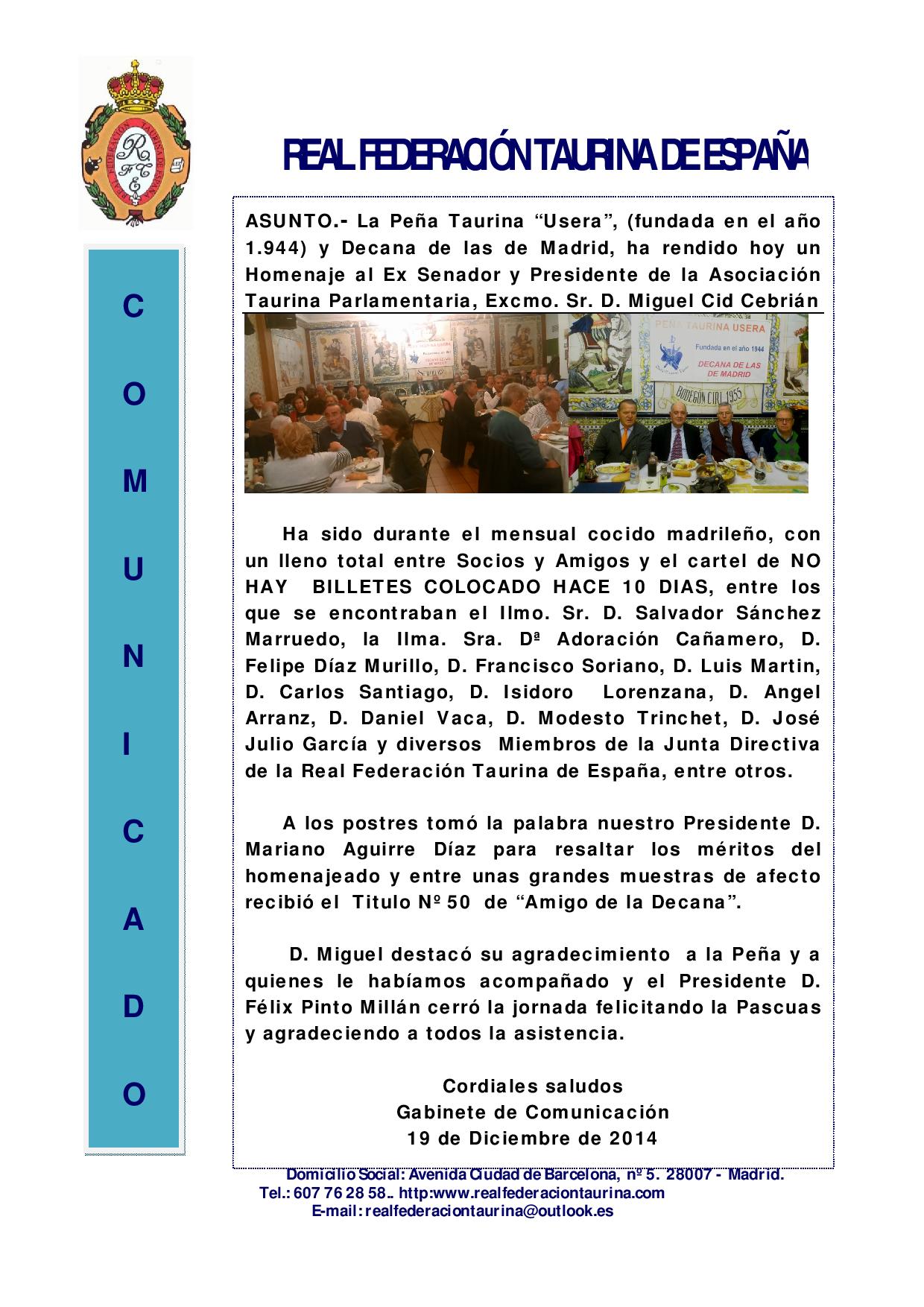 La Peña Taurina `Usera´ ha rendido un homenaje al Excmo. Sr. D. Miguel Cid Cebrián (Escalera del Éxito 44)