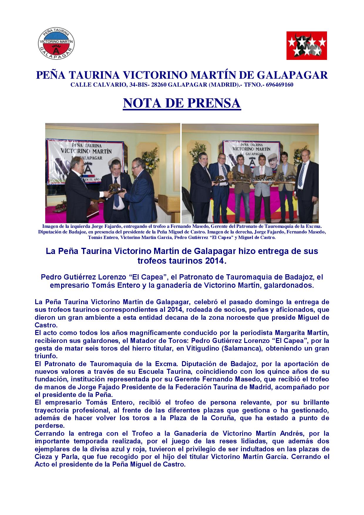 La Peña Taurina Victorino Martín de Galapagar hizo entrega de sus trofeos taurinos 2014