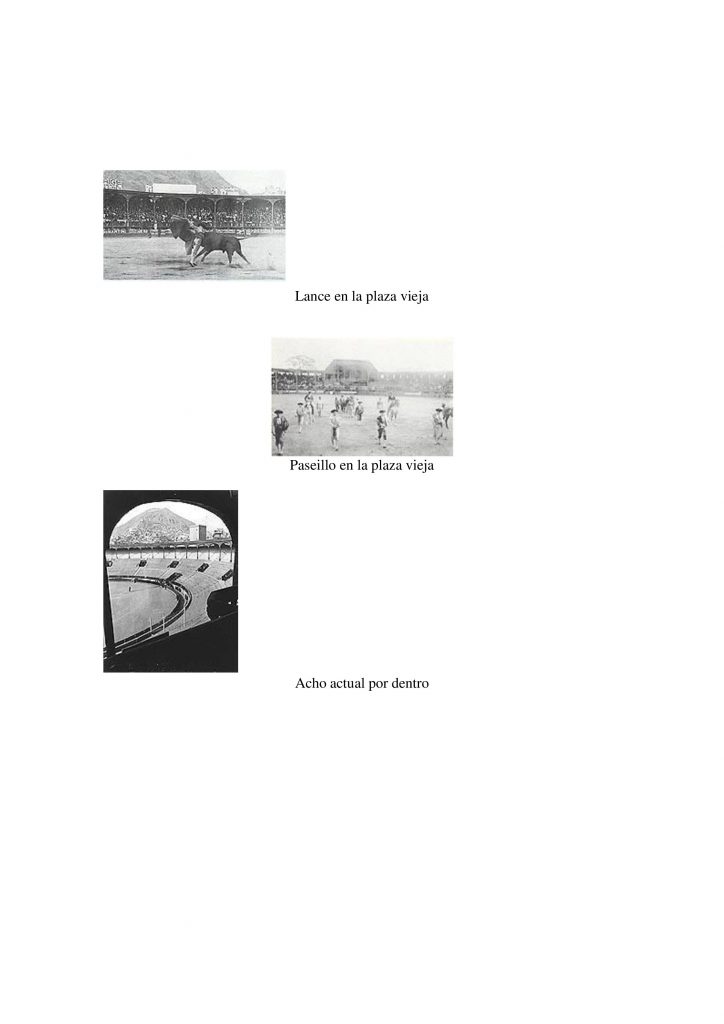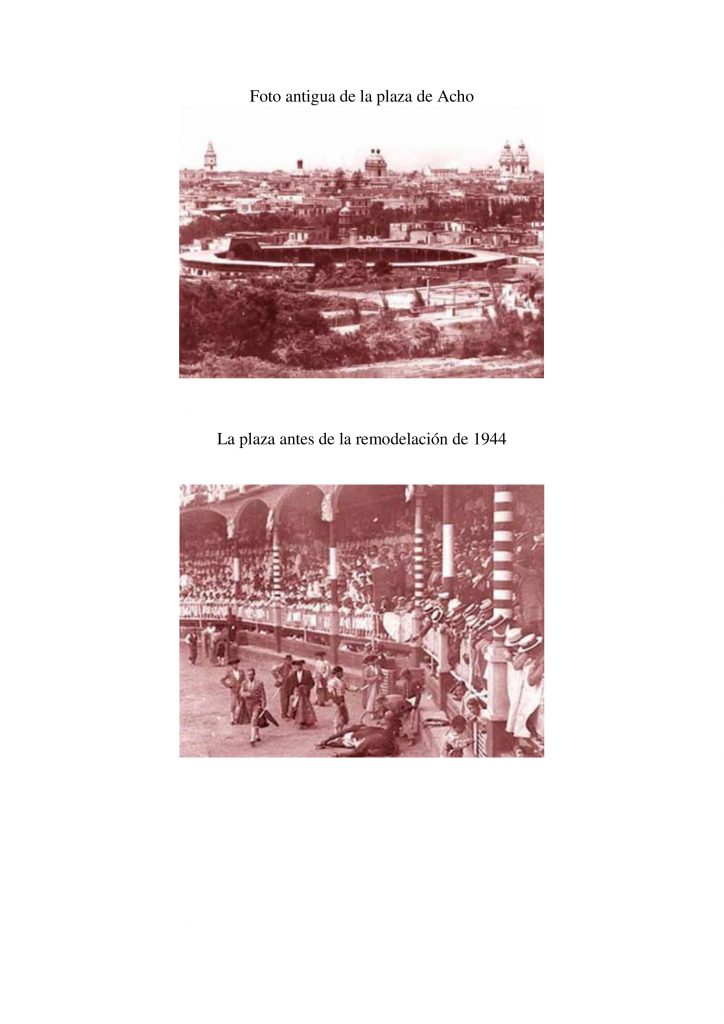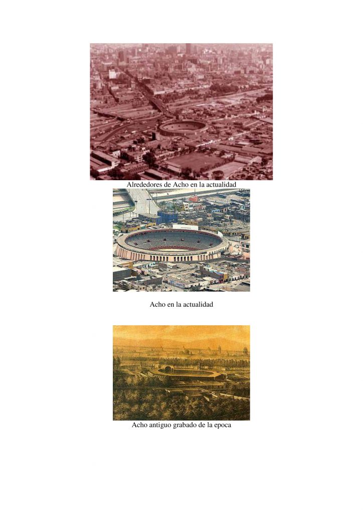 La Plaza de Toros de Acho esta enclavada en el actual distrito limeño del Rimac a la vera del cerro San Cristóbal, y del río del mismo nombre, en el mismo solar que se construyo en 1766. Se ha remodelado dos veces, la primera en 1863 que se gastaron 25,000 pesos de entonces en arreglarla y sobre todo en conservarla. Era un polígono regular de 15 lados que tenia 95 varas de diámetro y casi 300 de circunferencia. Sobre la mesa de los “cuartos” tres filas de escaños macizados con adobes, cuatro filas de gradas de media vara de alto y dos tercios de ancho, con sus asientos de madera de roble y mas gradas de media vara de alto y dos tercios de ancho, con sus asientos de roble, y mas gradas con escaño que respaldan contra el antepecho de las galerías. La altura de la fábrica hasta el piso de las galerías y corredores, es de 6 varas y la madera empleada en su construcción es roble de la mejor calidad. El ruedo tenia un diametrote 85 varas castellanas y las arquerías cubrían todos los tendidos llegando a los asientos llamados delanteros, contaba con unos algunos palcos nivel del ruedo por debajo de los tendidos que se llamaban cuartos.