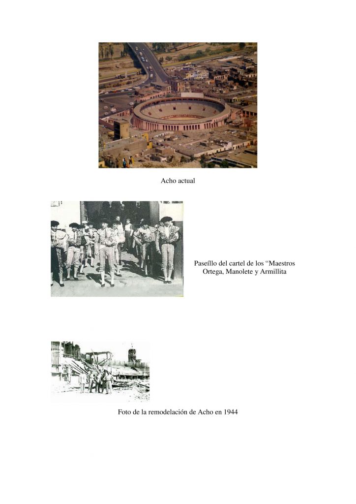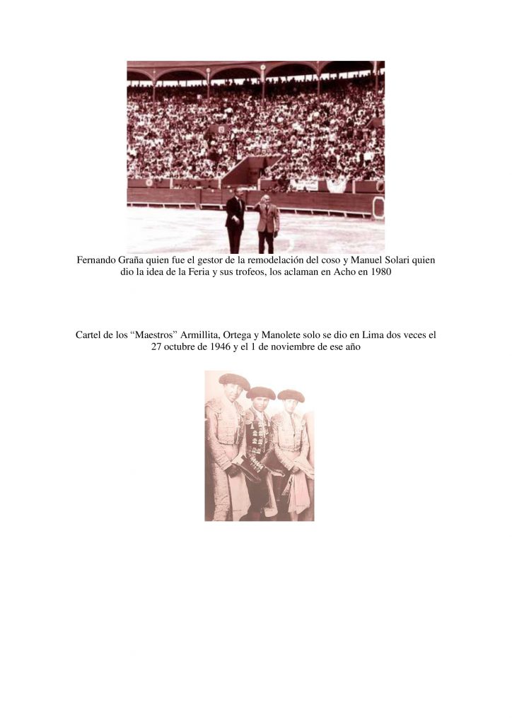Esta remodelación de la plaza de Acho, la mas antigua de América y una de las mas hermosas del mundo, llevada acabo por el entusiasmo por un grupo de aficionados peruano encabezados por el ganadero Fernando Graña Elizálde, permitió después de inaugurado el coso en enero de 1945 que culminara el anhelo de quienes batallaron en pro de la feria de Señor de los Milagros que contó también con opositores empecinados que defendían la realización de las tradicionales hasta entonces corridas veraniegas .