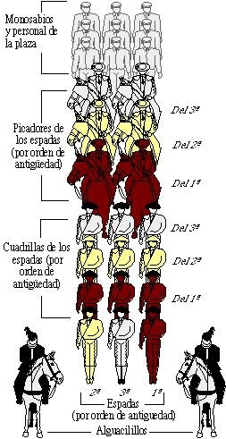 Toda corrida de toros comienza con el paseíllo, que está reglamentado en su colocación. Antiguamente existía la figura del “hondero”, que era el encargado de enganchar el toro a las mulillas.