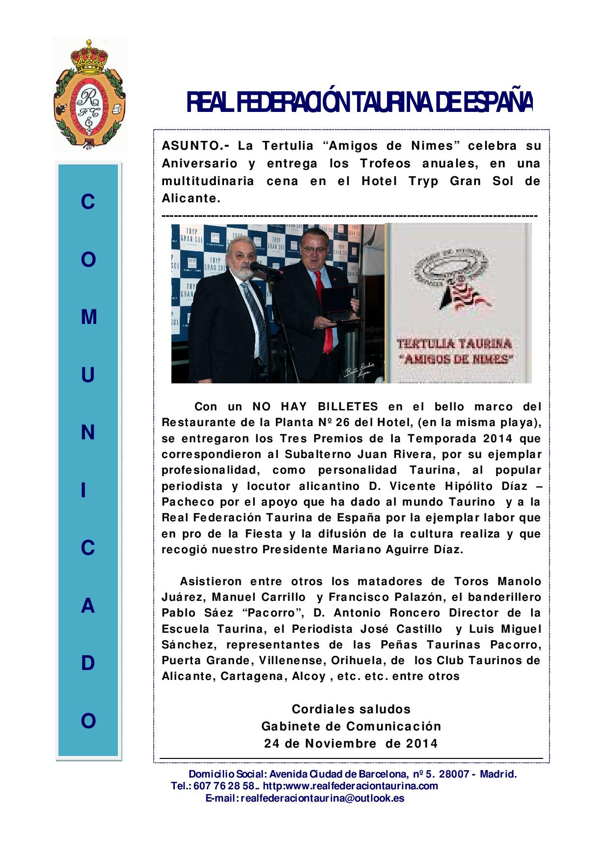 La Tertulia `Amigos de Nimes´ celebra su Aniversario y entrega los Trofeos anuales