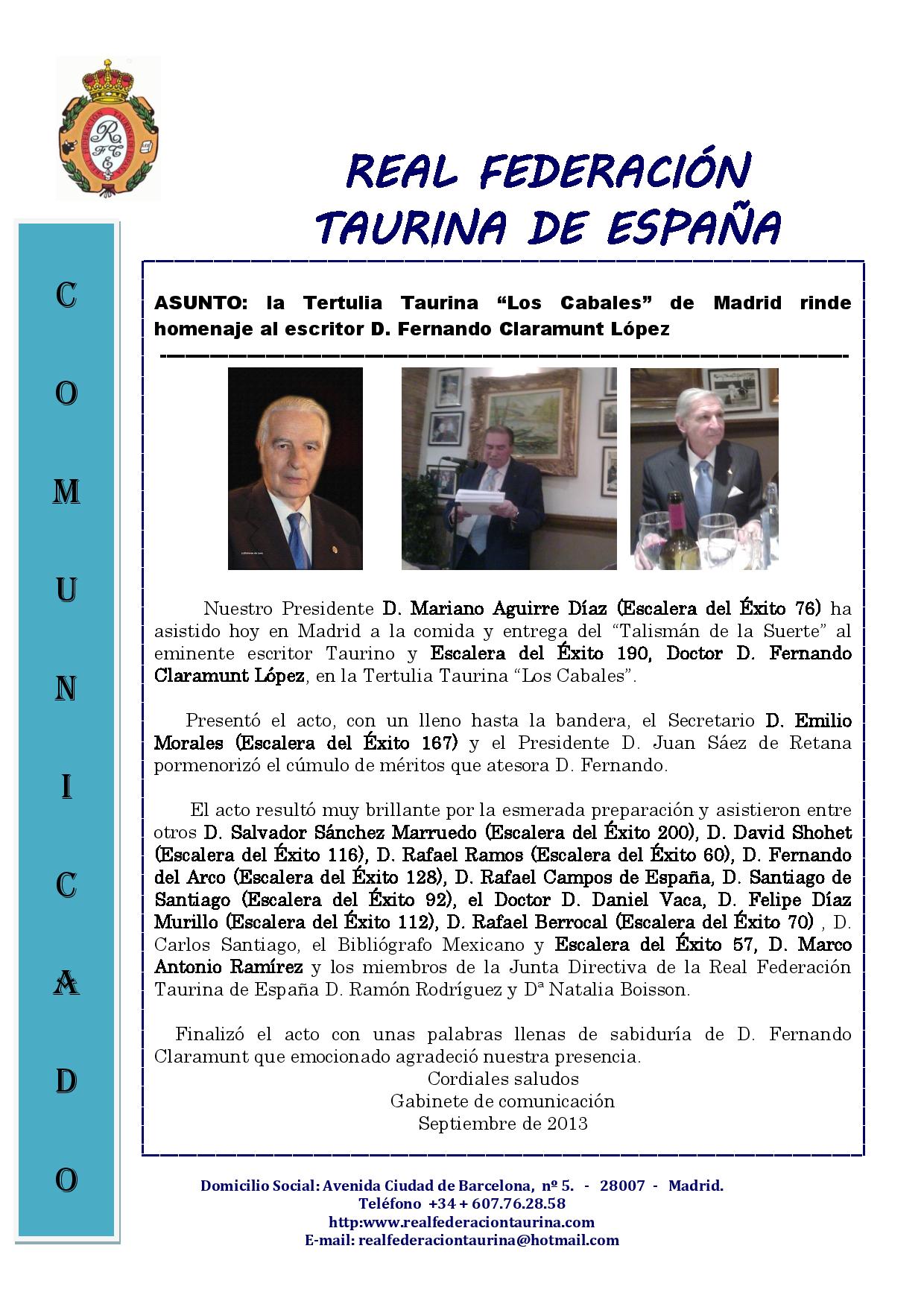La Tertulia Taurina “Los Cabales” rinde homenaje al escritor D. Fernando Claramunt López. Escalera del Éxito 190
