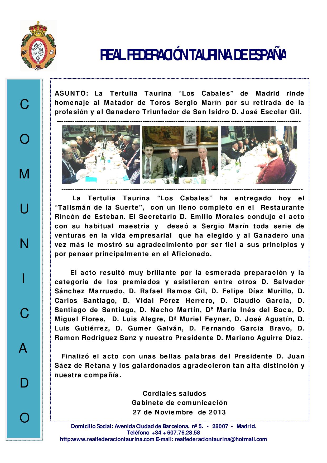 La Tertulia Taurina Los Cabales rinde homenaje al Matador de Toros Sergio Marín Ganadero José Escolar Gil – Escalera del Éxito 207