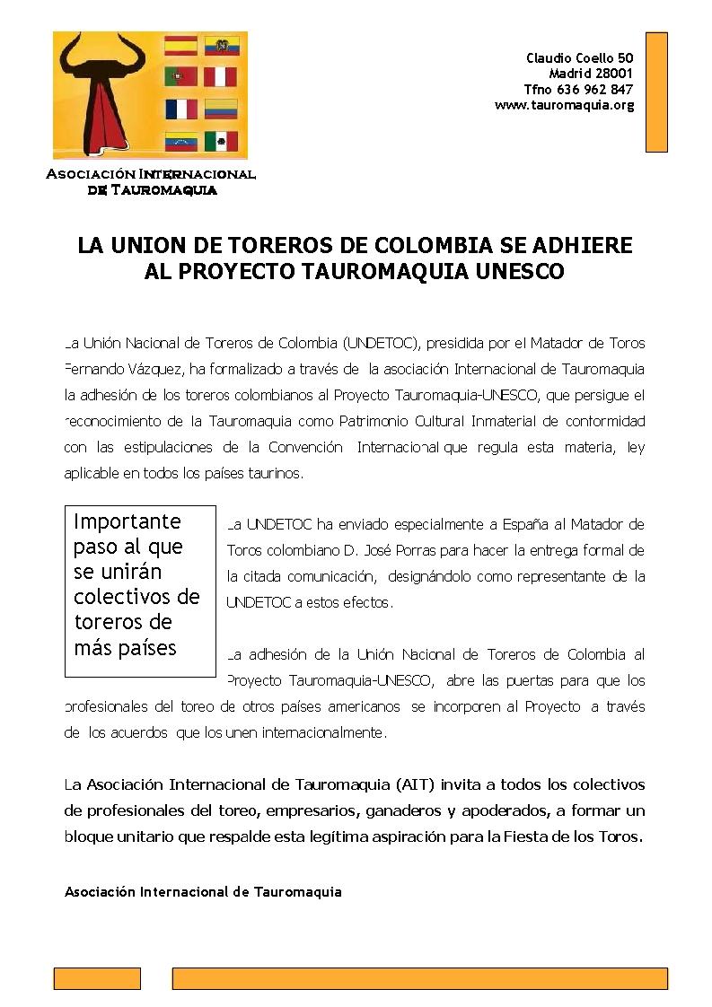 La Unión de Toreros Colombianos se une al Proyecto Tauromaquia-UNESCO