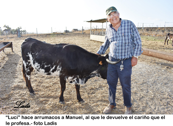 «Resulta que cuando nació su madre, que era primeriza, no le hizo el menor caso, entonces, alertado por el mayoral, la recogimos y a base de biberones y mucho cariño la sacamos para adelante. Desde pequeña ha dado muestras de su nobleza porque iba detrás de todos los de casa y aceptaba sus carantoñas. Como es natural fue creciendo y la tuvimos que llevar al cercado con otras vacas. Se tentó y fue espectacular su comportamiento, hasta el punto que ha parido varias veces y sus becerros han sido muy bravos. También nos dijo Manuel que a este animal lo quiere como si fuera una de sus hijas. Todos los días vengo a verla varias veces, dice, y disfruto estando un rato con ella. Mientras le acariciaba el testuz, apostilló rotundo que…» no me desprendería de ella por todo el oro del mundo. La considero de mi familia».