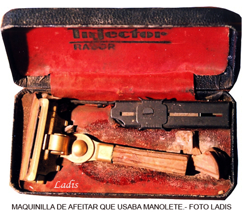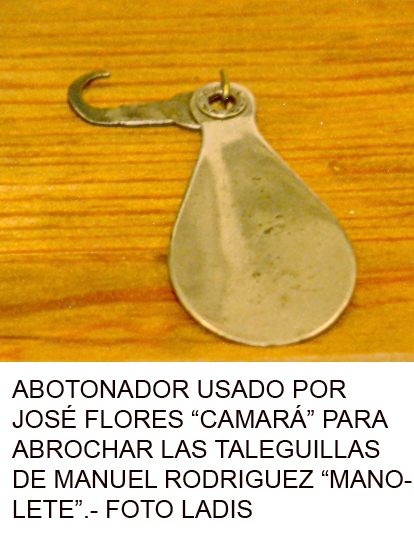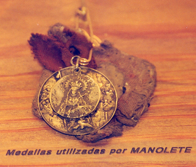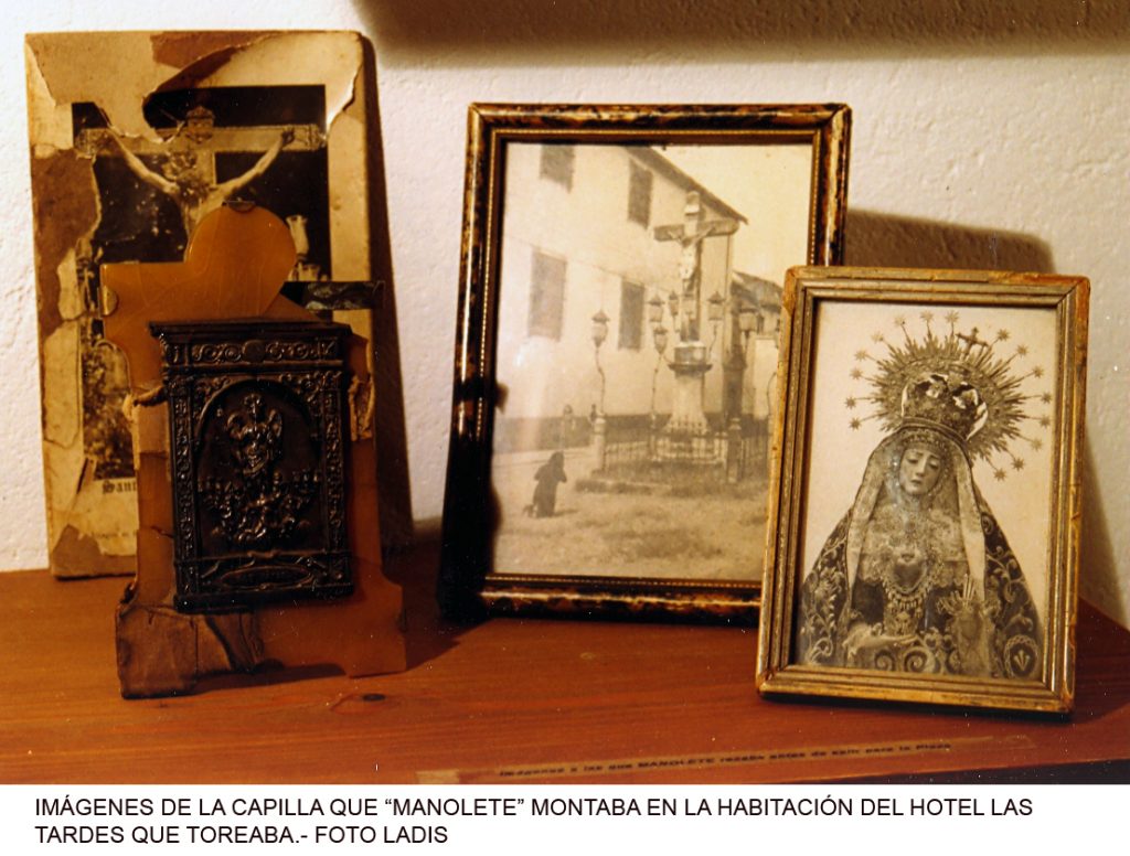 Colgadas en el centro de la vitrina están las medallas que Manolete llevaba colgadas al cuello el dĂa de su muerte junto al escapulario que perteneciera a El Guerra. A la izquierda las gafas de sol con las que tantas veces fue fotografiado Camará. El abotonador usado por Camará para abrochar la taleguilla al torero. En la parte derecha se encuentra la capillita que Manolete llevaba consigo a los hoteles a la que rezaba y se encomendaba cada tarde antes de salir a las plazas a jugarse la vida: una estampa del Cristo de los Faroles, una capilla de San Rafael Arcángel, una estampa de la Virgen de los Dolores, una foto con la imagen del Cristo de la Salud de Ecija y un altarcillo con la Virgen del Pilar que fue propiedad de “Lagartijo”. Una tĂa de JosĂ© Flores emparentada con “Lagartijo” se la regalĂł a Manolete y le tenĂa un especial apego.