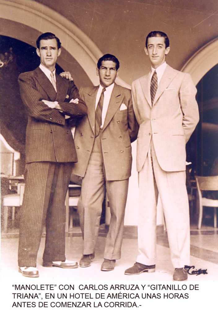 Colgada en uno de los pilares de esta sala se encuentra enmarcada una carta manuscrita de Wiston Churchill dirigida a Manolete, en la que le daba las gracias por haberle regalado la cabeza de un toro de Baltasar Iban, disecada que llevaba en la testuz la V blanca de la victoria. Un documento curiosĂsimo y desconocido que da idea de la dimensiĂłn social que llegĂł a tener el torero cordobĂ©s. Al otro lado del pilar cuelga una foto de Manolete toreando en Barcelona a un toro de Miura y debajo la reproducciĂłn litográfica de esa imagen dedicada y firmada por Antonio Ordoñez a quien en esos dĂas era su apoderado JosĂ© Flores Camará, en la que dice textualmente refiriĂ©ndose a Manolete que “ese era su torero”, al que siempre admirĂł.