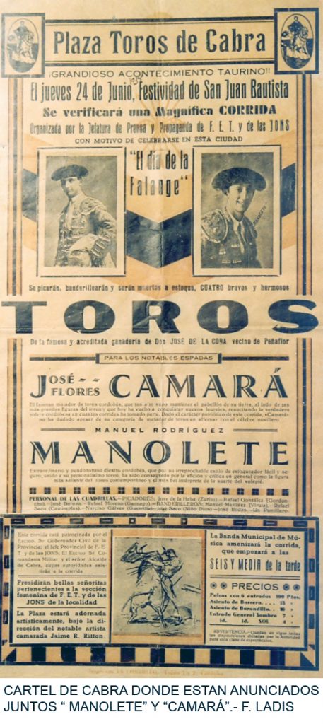 Es difĂcil creer que en pleno Parque Natural de la Sierra Norte de Sevilla, cerca de Constantina, se encuentren las almas de Manolete y Camará, en el SalĂłn Taurino del Cortijo de Las Bernabelas, propiedad de Manuel Flores Cubero “Manolo Camará”. Es difĂcil de creer pero asĂ es. Manolo Camará ha dedicado, con muchĂsimo cariño y mimo, dos amplios salones de su finca de Las Bernabelas a dar cobijo a multitud de objetos, recuerdos, carteles taurinos y maravillosas fotografĂas, testimonios de las vidas de dos hombres que han dejado una profunda huella en la historia de la tauromaquia, binomio perfecto que fueron Manuel RodrĂguez “Manolete” y JosĂ© Flores Camará. Para los que sentimos con el corazĂłn todo lo relacionado con la Fiesta, aquel salĂłn taurino es casi un santuario, que a primera vista emociona y sobrecoge, pues se siente que el espĂritu de estas dos personas está allĂ, quieto, dormido y tranquilo, con el canto de los jilgueros y los gorriones de fondo. Manolo Camará retirado desde hace ya tres años del mundo del toro, vive la mayor parte de su tiempo refugiado en aquel paraĂso terrenal que se encuentra en el norte de la provincia de Sevilla. AllĂ pasa los dĂas rodeado de su amplia y maravillosa familia, con sus recuerdos, sus pájaros perdices, entre jabalĂes, corzos y ciervos, y la satisfacciĂłn de haber dejado a la “Casa Camará” en el mismo pedestal que la dejara su padre. Ha tenido la inmensa bondad, por la amistad que nos profesamos, de mostrarnos este maravilloso secreto suyo y de su familia. Es como si nos hubiese abierto su propio corazĂłn, pues nos fue mostrando con entusiasmo paulatinamente, todos los objetos que allĂ permanecen con el tiempo parado a sus espaldas.