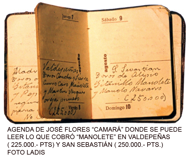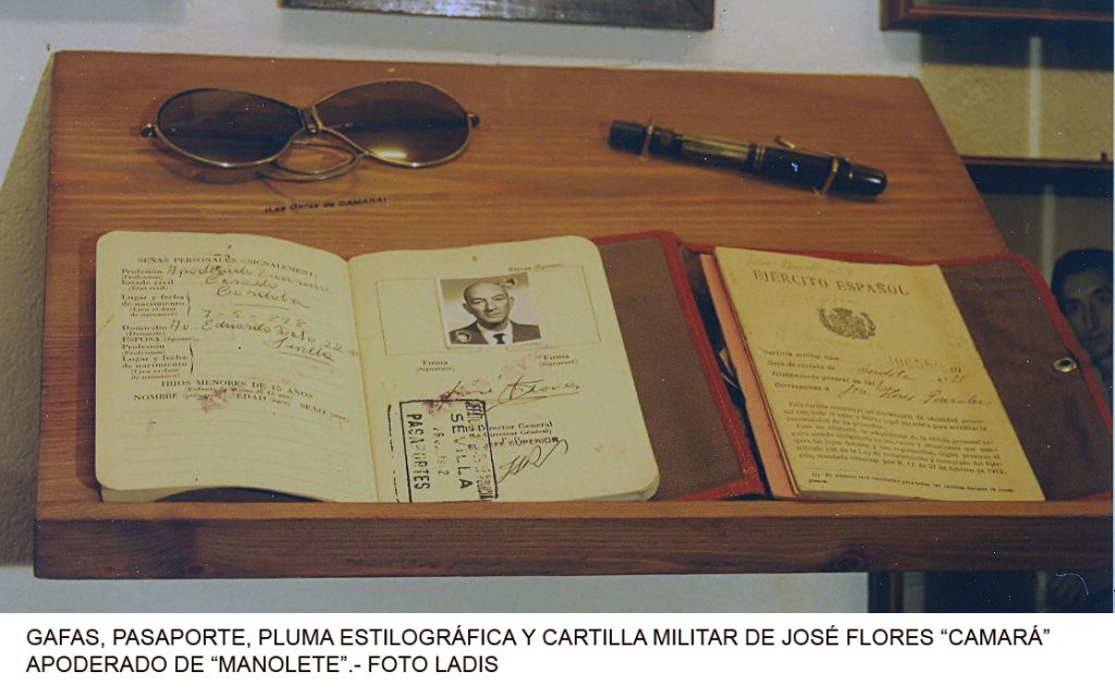 AllĂ se encuentra tambiĂ©n ese importante documento que ha marcado un hito en la historia del apoderamiento, en el cual Manolete otorga a Camará amplios poderes notariales para administrar todos sus bienes a su antojo. Se expone una radiografĂa de la clavĂcula izquierda del torero, fruto de una lesiĂłn sufrida en Alicante en 1945, y las agendas de mano de Camará de los años 1944 y 1945, donde el apoderado iba apuntando los lugares por donde toreaba Manolete, los trofeos que lograba y el dinero que cobraba en cada plaza (entre 215.000 a 250.000 pesetas de la Ă©poca). En la vitrina casi escondido, está el guante blanco de piel de una señora de Barcelona que fue “Miss Ojos” y que se lo tirĂł a la plaza a Manolete una tarde de triunfo. Ese guante iba siempre en el equipaje del torero como un talismán que le daba suerte.