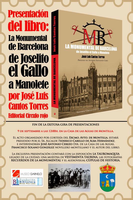 La gran biografía de La Monumental de Barcelona finaliza después de 15 meses de brillantes presentaciones, la memorable gira que ha realizado por España y Francia. El acto Histórico-Taurino-Cultural se celebrará en Montilla (Córdoba) el 9 de septiembre a las 12.00h. en la maravillosa Casa de las Aguas, un referente cultural cordobés. El evento organizado por el Excmo. Ayto. de Montilla estará presidido por el Sr. Alcalde Federico Cabello de Alba Hernández, e intervendrán José Antonio Cerezo Dir. de la Casa de las Aguas, Francisco Solano González novillero montillano y el autor del libro José Luis Cantos Torres. En la excepcional presentación, se podrá visionar una muestra de VESTIMENTA TAURINA propiedad de Francisco Solano, la colección fotográfica RECUERDOS DE LA MONUMENTAL y el audiovisual CÚPULAS DE HISTORIA, una fusión de historia taurina y música compuesta por el autor del libro. Como gran atractivo de la presentación, se inaugurará la inédita exposición titulada LA TAUROMAQUIA, un soberbio legado de documentos, libros y carteles extraídos de la FUNDACIÓN MANUEL RUIZ LUQUE propiedad de la ciudad de Montilla y que podrá ser visitada hasta el 26 de septiembre
