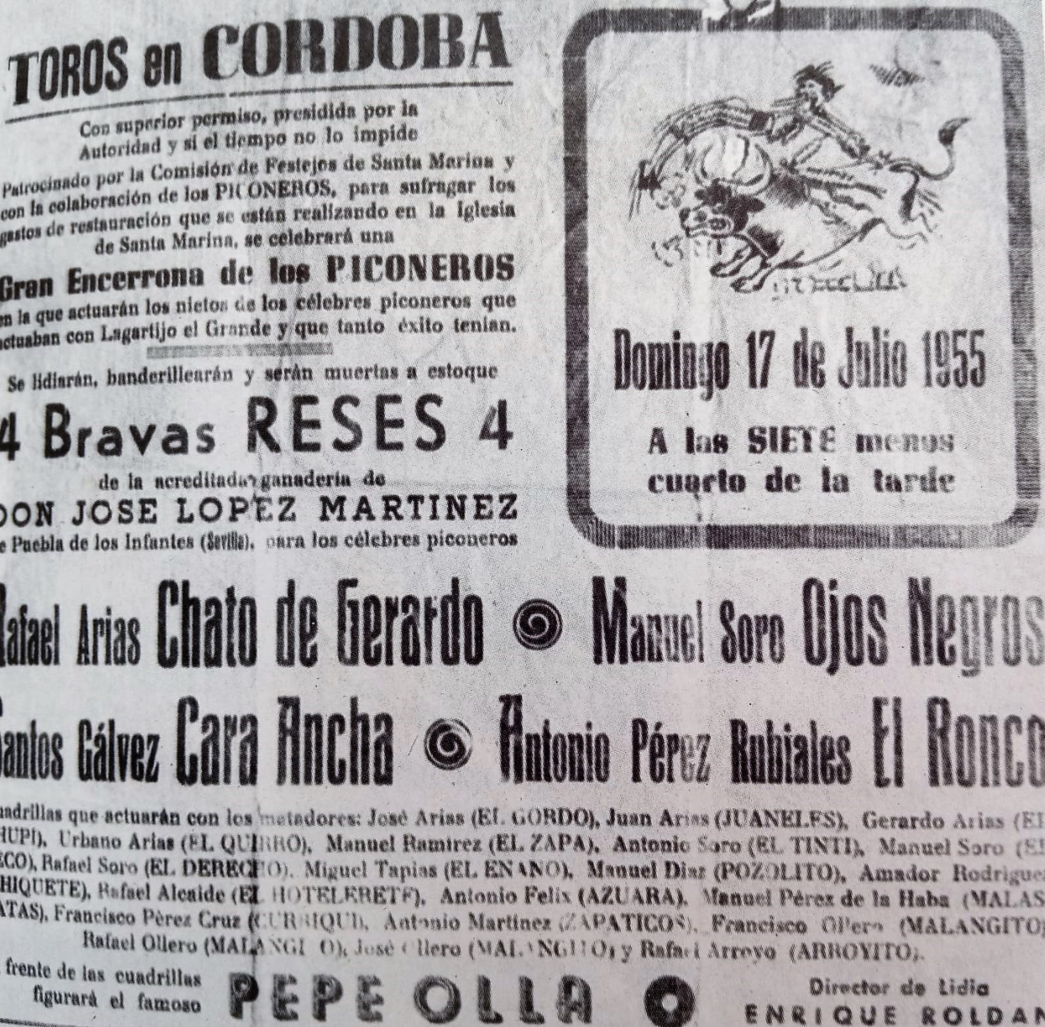 «Pero ellos, de nuevo, estaban allí, en el coso de «Los Tejares» el domingo 17de julio de 1955, en su última encerrona piconera. Fueron anunciados como los «nietos de «El Pilindo», de «El Manene» y de «El Retor», juntos a los demás «amigotes» de  «Lagartijo el grande».