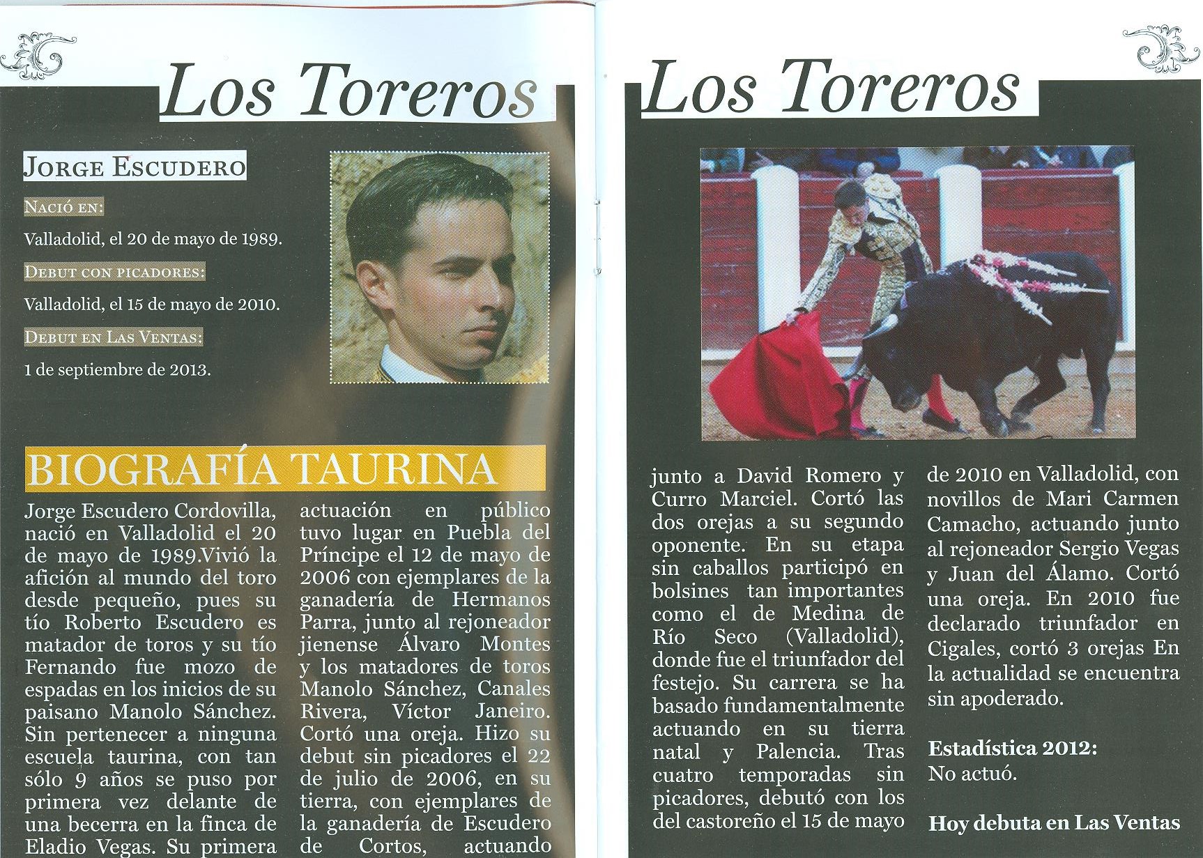 A Jorge Escudero se le vio decidió a recibir a porta gayola al primero. El novillo de salida se fue hacia él, no obedeciendo el juego del capote, y le cogió volteándole y corneándolo en el muslo repetidamente. Es una cogida de gravedad.