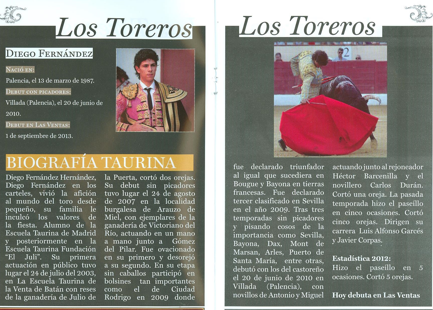 Se las vio con el tercero, primero de su lote y debió haberse corrido en segundo lugar. Nos obsequió con buenas y templadas verónicas. El novillo se salió suelto en varas y en banderillas cogió, propinándole un revolcón al peón Curro Robles sin nada más que lamentar. Las buenas hechuras toreras de Diego redondearon una faena muleteril dominando la embestida bronca del novillo. Al que despachó atacando con el brazo suelto de pinchazo y estocada. Saludó desde el tercio. El quinto, segundo de su lote, noble de embestida, resolvió la faena con buen estilo y lucimiento, rematando la labor con molinetes apretados. Con el brazo suelto sumó un pinchazo y estocada trasera. Hubo saludos del público que se mostró frío la mayor parte de la tarde.