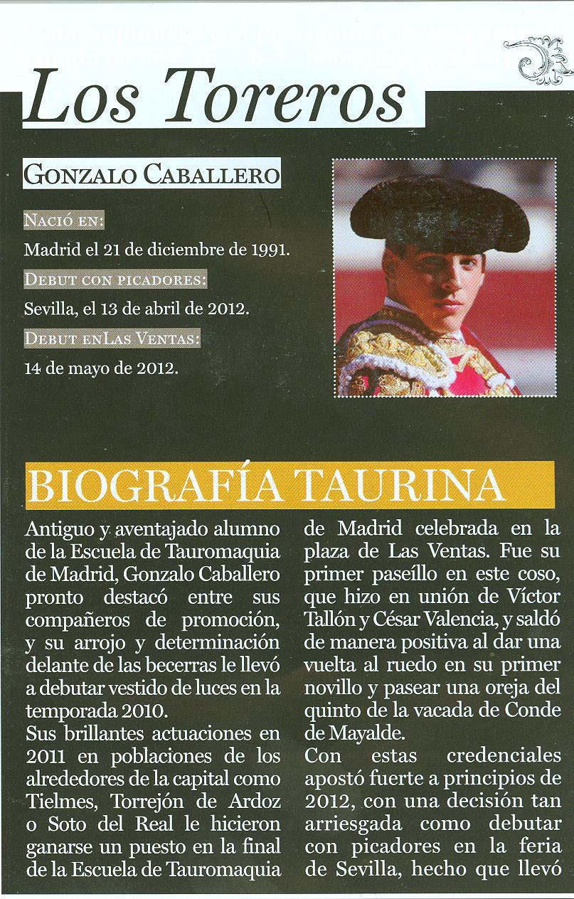 Gonzalo Caballero se le vio sereno y con torería. El segundo se salía suelto con intención de saltar la barrera. Embistió con genio y ligó pases con sello de torería dominando la embestida descompuesta del novillo. Terminó con una estocada trasera, otra estocada contraria y se acostó el toro. Se levantó y sonó un aviso, terminó rematando con el descabello. Ante el quinto, manso y huido que se salió suelto en varas tomó la muleta porfiando y al fin logró pases muy toreros. Acabó de un pinchazo y un metisaca rematando con el descabello. Arrastrado el manso saludó desde el tercio.