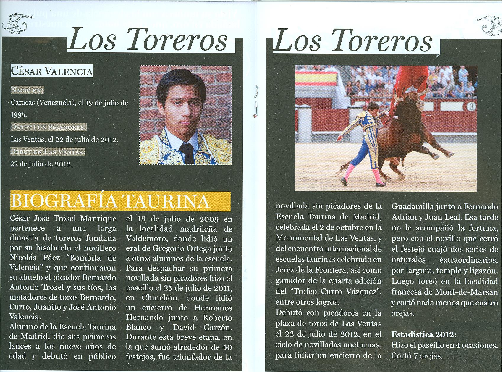César Valencia se mostró muy decidido, pechó con el tercero, corretón, manso y sin fijeza. Se salió suelto en varas, hizo hilo con los banderilleros después de que clavaran. Pases movidos hasta acabar de una estocada. Recibió al sexto a porta gayola y el novillo barbeó las tablas, se fue suelto de los capotes. En varas peleó corneando el estribo. Con flojedad de manos llegó al último tercio y deslució todo intento de muleteo. Puso punto final de una estocada.