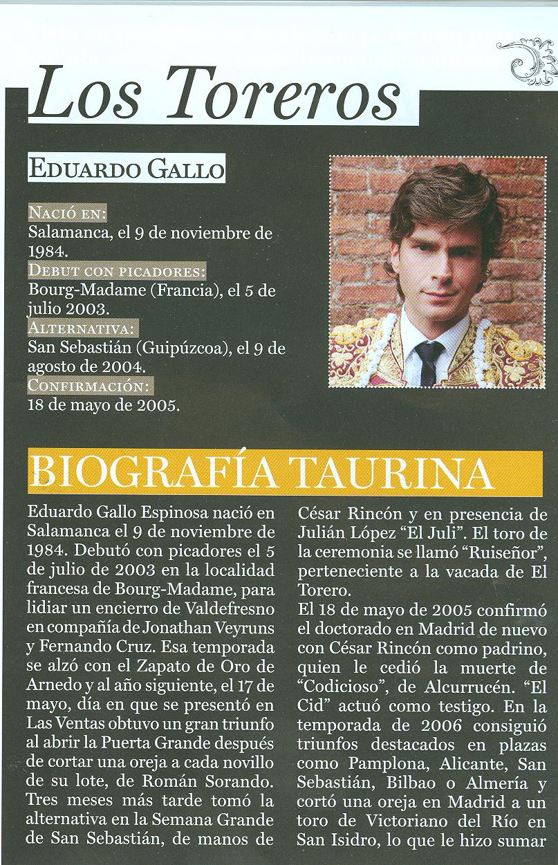 Eduardo Gallo se encontró con el segundo, suelto que barbeó las tablas. Se lució en un quite por verónicas, esto fue lo único en que se lució pues no hubo nada mas que hacer. El toro rodó por la arena y tiró en su caída al torero. No era posible hacer más y lo despachó de una estocada. El quinto se dio un golpe de salida con el burladero y quedó resentido y sin fuerzas, los cabestros de Florito se lo llevaron al corral. En su lugar salió un sobrero de José Vázquez este toro llegó a la muleta embistiendo sin parar, series de naturales que remató de una estocada ladeada atacando con el brazo suelto.