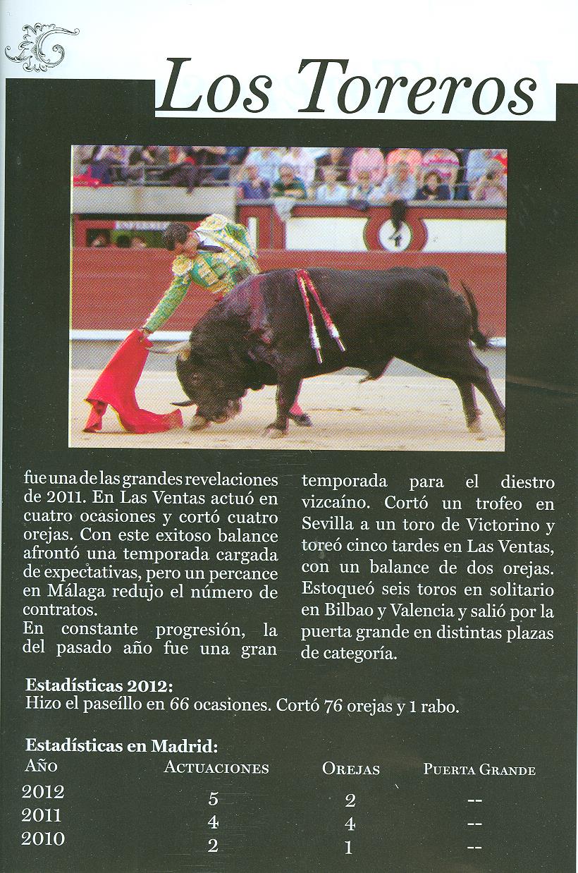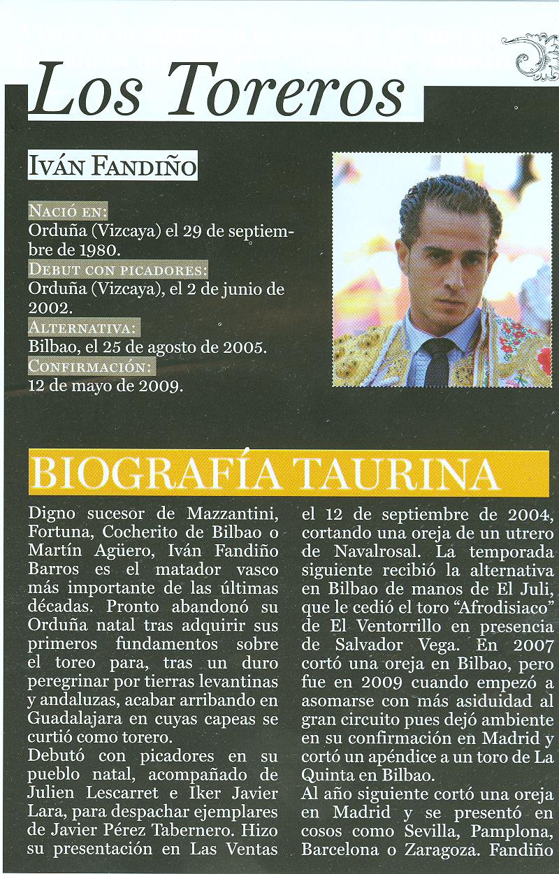 Iván Fandiño se le vio muy decidido con el segundo, toro encastado que embistió bien a las series de naturales cerrando con el de pecho, repitió con la derecha sin cruzarse lo debido pero se le veían ganas en las tandas de muletazos y a la hora de matar se fue detrás de la espada atacando con el brazo suelto y entregado, el toro le cogió propinándole una herida grave en el muslo interesando la femoral. Cogida de pronóstico grave. Petición de oreja que se concedió ante la petición general del público.