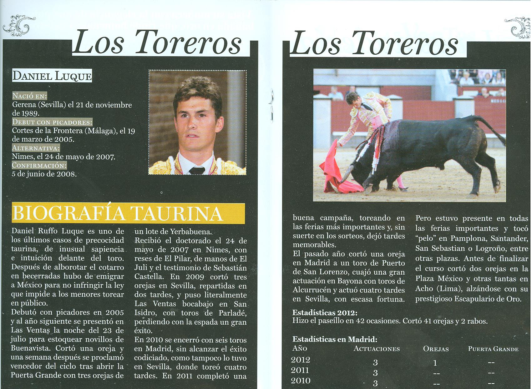 Daniel Luque que apunta buen estilo torero, recibió al tercero que salió con arrancada fuerte y lo recogió bien con el capote. El toro derribó en varas dejando ver que estaba bien encastado. Muleteo citando fuera de cacho, pases y más pases pero sin ligazón. Atacando con el brazo suelto dejó una estocada. Lidió al sexto en quinto lugar para evitar que El Cid lidiase dos toros seguidos por tener que matar al segundo del lote de Fandiño. Brindó a la cuadrilla del diestro y con voluntad sacó muletazos ligados pero sin eco. Mató de estocada y se acabó la corrida de la prensa del año actual.