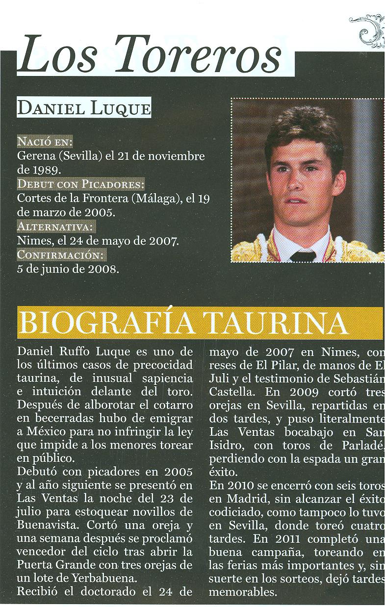 Daniel Luque se encontró con el segundo en noble condición, lo recibió con lances largos. Con poco celo y fallando de manos en la segunda vara el toro volvió a doblar de manos y en el quite se calló. Fue devuelto al corral. El sobrero de El Torreón noble y justo de fuerza en el primer puyazo se dobló de manos y en el segundo lo volvió a hacer. La faena por derechazos citando con el pico de la muleta sobre la mano izquierda. Acabó de dos pinchazos y estocada trasera con derrame externo. El noble quinto toro al salir de varas se dobló de manos, llegó incierto a la muleta y se lo quitó de delante de pinchazo sin soltar, dos pinchazos y descabello.