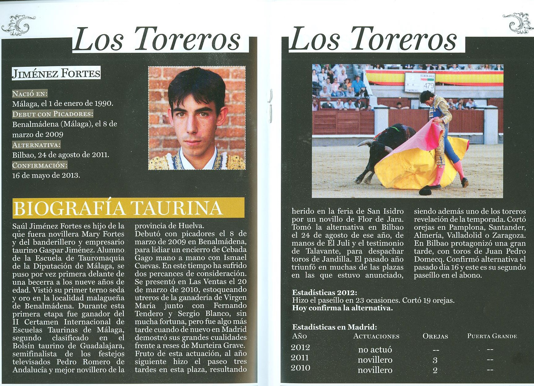 Jiménez Fortes tuvo en el tercero un toro noble y parado. Peleó con el caballo y al salir de la suerte sufrió una fuerte voltereta que supone más fuerte que un puyazo. Inició la faena por derechazos y se vio al toro con fuerza y corto de embestida. Insistió el diestro por la izquierda y ya no hubo más acabó de estocada corta y delantera. El sexto salió suelto en varas, en el quite sufrió un resbalón. Incorporado derrama citas al toro que no le ayuda en la embestida. Insiste así hasta que se lo quitó del medio con brevedad.