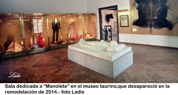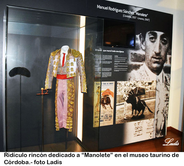De «Manolete», que es quien nos ocupa, solo se expone un vestío de torear, la montera, el estoque y las dos orejas y rabo de «Islero». ¿Qué hacen guardados (?) los demás vestíos y objetos que se mostraban en su exclusivo y amplio espacio? ¿Que ha sido del despacho que estaba montado en una habitación anexa? ¿Donde está la mascarilla de escayola que se le extrajo al cadáver? ¿Donde está la piel de Islero que se mostraba extendida en un lateral desde 1956 en que llegó al Museo?.¿Donde está la figura yacente que presidía su sala, copia de la que le realizara Amadeo Ruiz Olmos para su mausoleo y que daba un halo de misterio y respetuosa solemnidad a la sala?