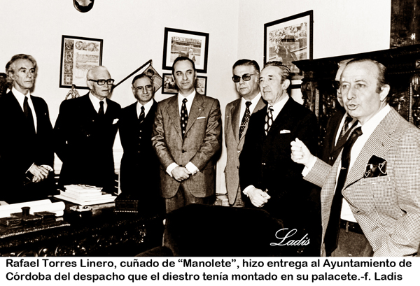 Recuerdo, que en 1972, se citó en la casa al alcalde, al presidente de la Diputación, toreros de la época de «Manolete» y críticos taurinos, para hacer entrega al consistorio de un capote de paseo y del despacho del torero para su ubicación en el Museo Taurino de la ciudad. Posteriormente, en 1976, gracias a la mediación del querido periodista José Luis de Córdoba, pude fotografiar de nuevo la mansión entera, sus dependencias, sus muebles, todos los vestidos de torear y los armarios con toda la ropa de calle que usaba el IV Califa.