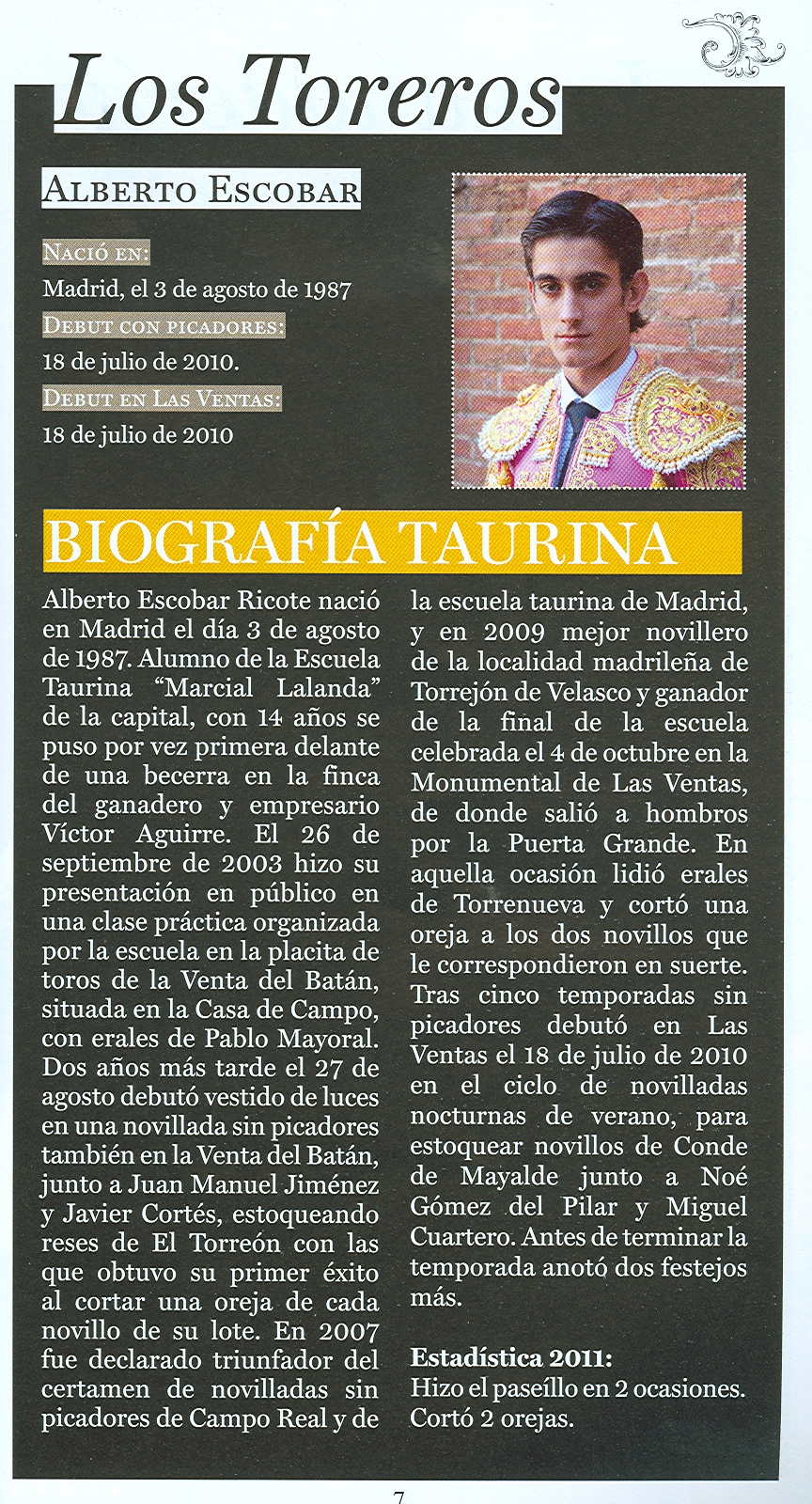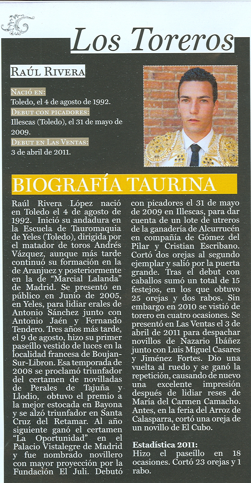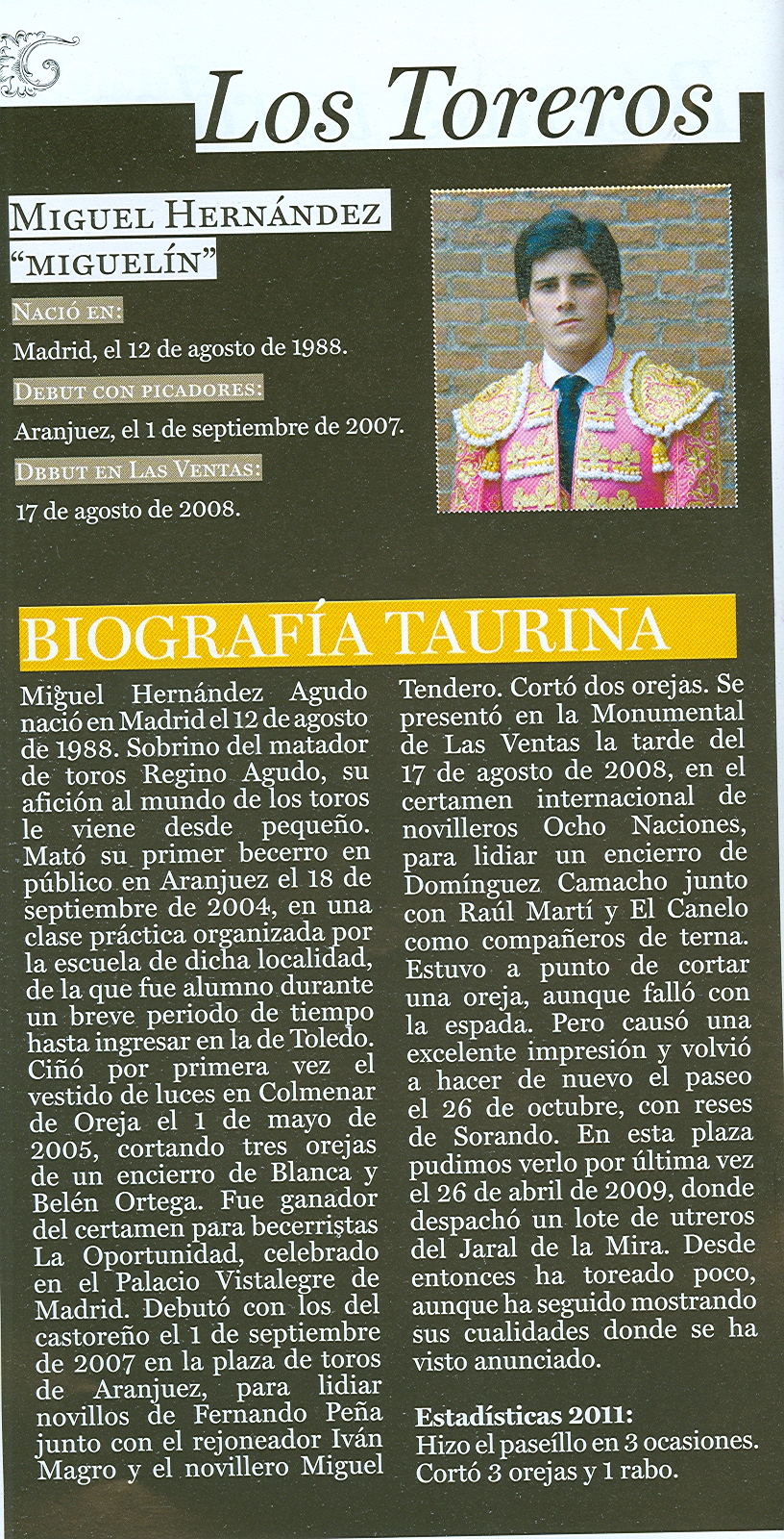 Dieron cuenta del encierro de las referidas divisas los novilleros Miguel Hernández «Miguelín», de Madrid; Raúl Rivera, de Toledo y Alberto Escobar, de Madrid. Los tres pusieron voluntad y decisión. Con el capote se les vio mas acertados que con la muleta ante sus enemigos que tuvieron siempre delante y sus complicaciones al embestir. Con el estoque se mostraron deficiente por no hacer la suerte correctamente.