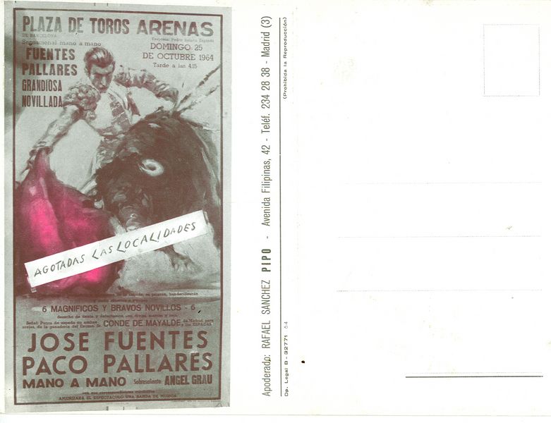 El apoderado Rafael Sánchez "Pipo" en el año 1964, felicitación de navidad en tarjeta postal de presentación de los toreros José Fuentes y Paco Pallarés.